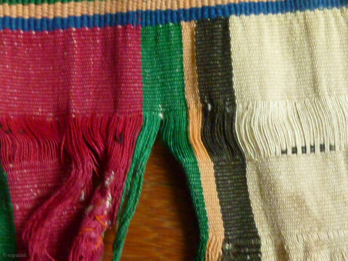 Burmese Woman’s Blanket: Woman's Blanket from the Chin, Mizo people of Assam or Western Burma. This type of “prestige cloth” would be worn only by women on ceremonial occasions. Some stains, splits at the ends but exceptionally rare and very fine weaving incorporating several techniques. Silk warp cotton weft. Approximately circa 50- 80 years old. w: 101cm/40in and l: 236cm/93in