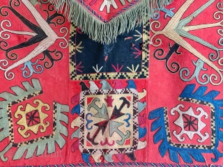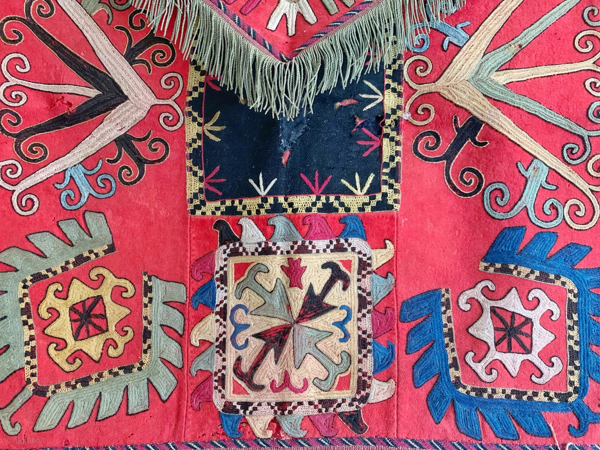 An exceptional antique Uzbek Lakai tribe silk embroidery known as Ilgich / Ayna Khalta. Dating to the 19th century, this is unquestionably one of the earliest, most coveted and unusual examples you will see. The unique eagle motifs drawn in a free flowing manner on each sides only appear in older examples. This bridal textile art was a mirror bag cover with false envelope shaped flap at the top and part of the wedding ceremony, after which it would have been hung in the home as Talismanic embroidery. The fine polychrome silk embroidery is done on a wool ground. On the triangle flap we see the classic Lakai motif of protective eye with two stars on each side. On the bottom corners we see another two classic Lakai motifs repeat in alternating colours surrounding a unique box central motif with arrow, rams horn and bird inner detail and profile eaglet repeating in alternating colours on the outer edge. But the most distinguishing motifs are the two curling patterned eagle motifs on each side. The colours are fantastic and all look natural. It has the original silk tassels and backed with a printed cotton. This is as good as Lakai embroideries get and worthy of any top collection. Size: 53cm x 50cm (21” x 20”) with tassels extending an extra 7.5cm (3”).