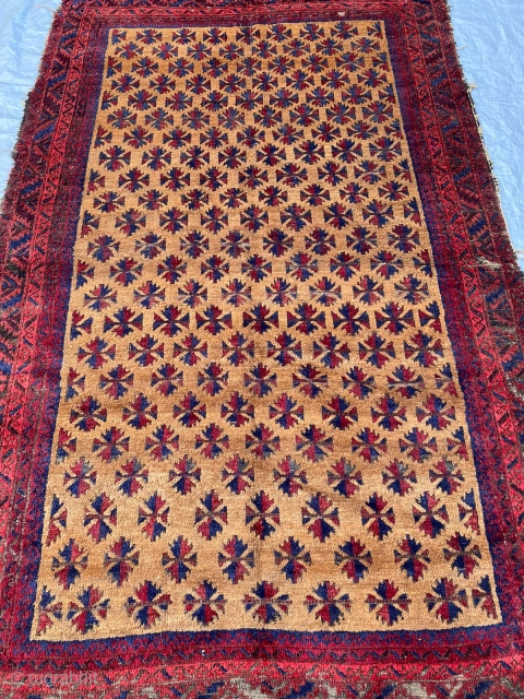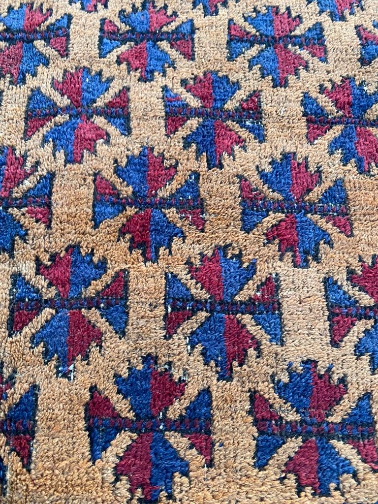 Antique, quite old, Baluch rug. Unusual large size undyed camel hair field. Love how the spacing of the leaves become more generous. 230 x 140cm or 7'7" x 4'8"