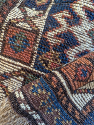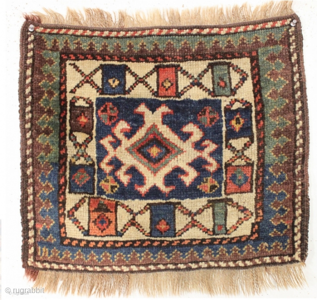 Persian bagface. Hard to place this one -- punt and say: Kurdish? Overall nice design with an unusual main border. a smaller piece that reads well from a distance. Very good condition. 19" x 21". Note: the main image has a yellow cast. The colors of the additional images are the true colors.
