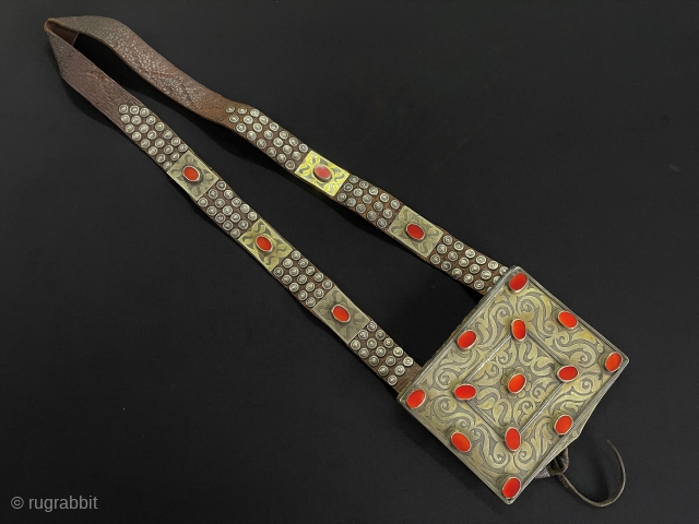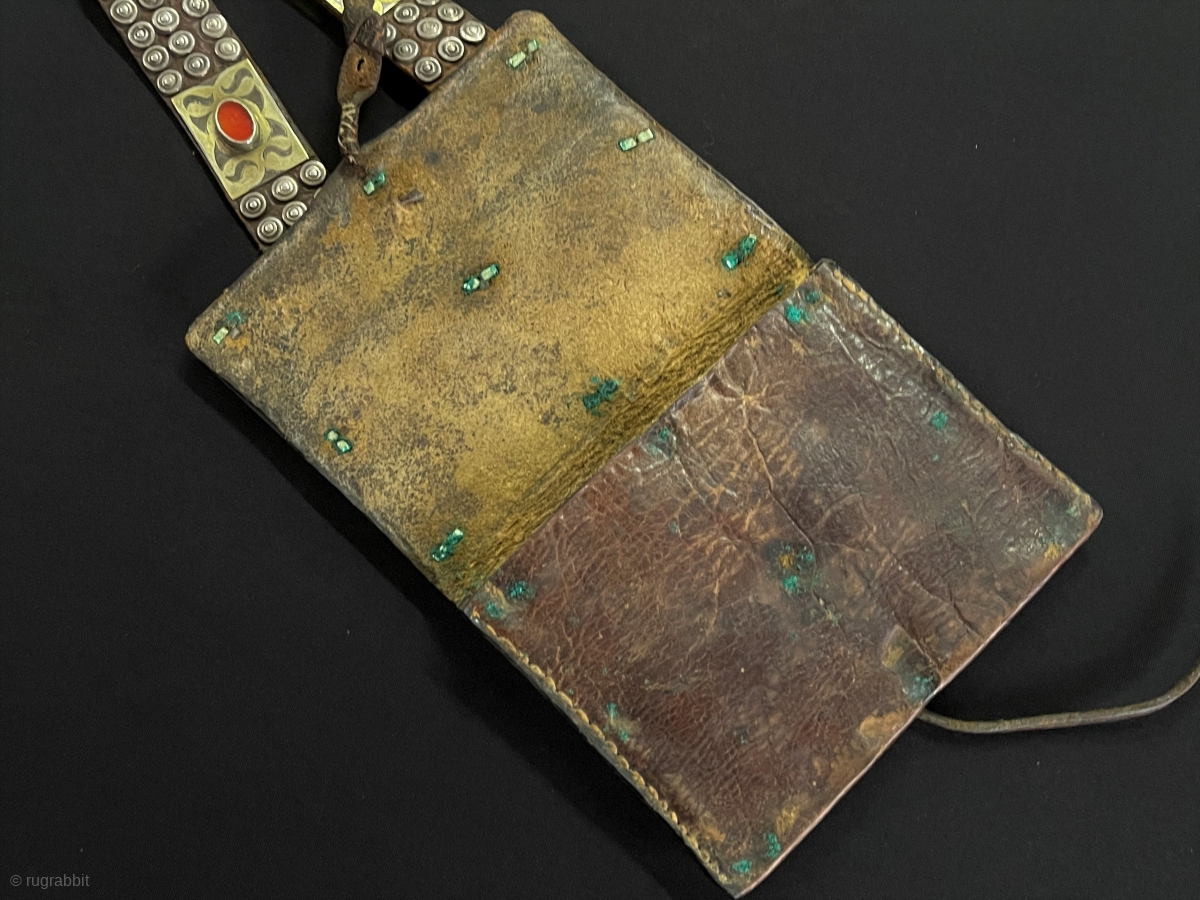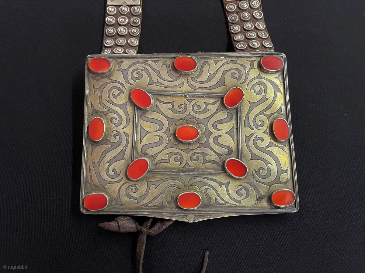 Antique Turkmen Ethnic Tribal Silver Bag & Heikel Fire Gilded Carnelian with Old Leather. Very Fine Handcrafted. This is Turkmen Art Jewelry. Circa - 1900 Size - ''12 cm x 15 cm'' - Lenght : 60 cm - Weight : 368 gr.