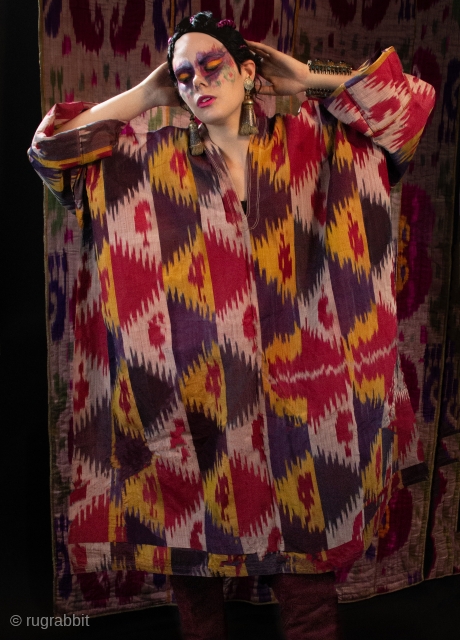 Antique Ikat silk tunic from Bukhara can be worn loose or belted. Fits all . see singkiang.shop for purchase info@singkiang.com