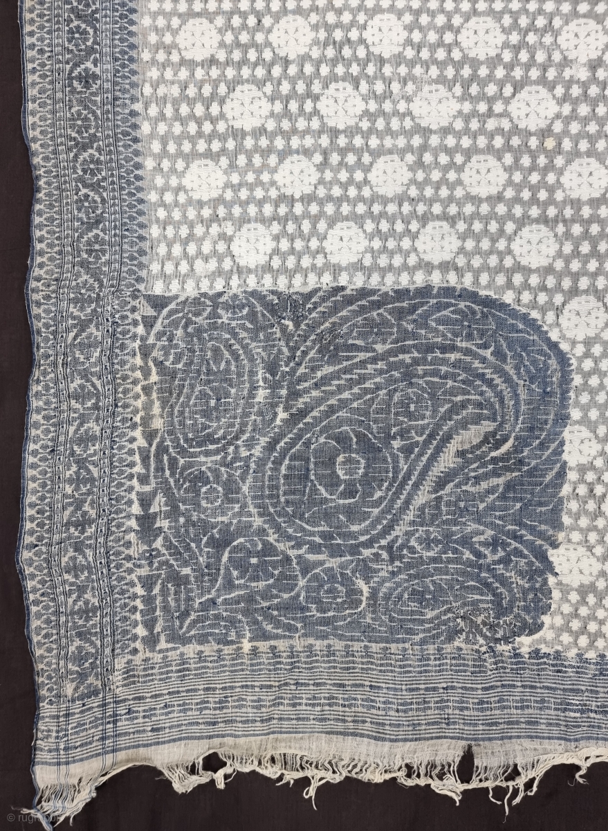An Rare And Very Fine Quality Jamdani Finest Muslin Cotton Saree, With Double Pallu And Signature, From Dhaka District of Bangladesh.North-East India.India.Jamdani was originally known as Dhakai named after the city of Dhaka, Jamdani is Persian deriving name from 'Jam', meaning flower, and 'Dani', a vase or a container, named after decorative floral patterns found on Dhakai textile. Jamdanis are popularly known as Dhakai Jamdani or simply Dhakai.