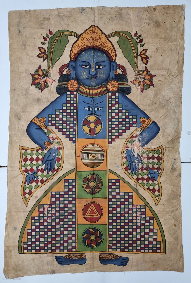 Jain Cosmology Painting of Lok Purush From Gujarat India.Hand Painted on the Cotton.The drawing is not just a painting for the sake of art. It contains deep explanations of Jain cosmology using the symbol of the cosmic man – with each component depicting an aspect of the universe in the Jain belief.