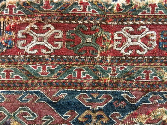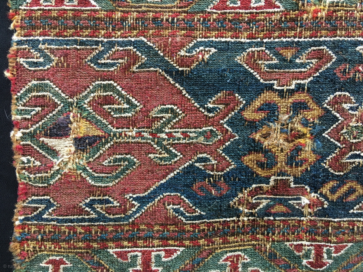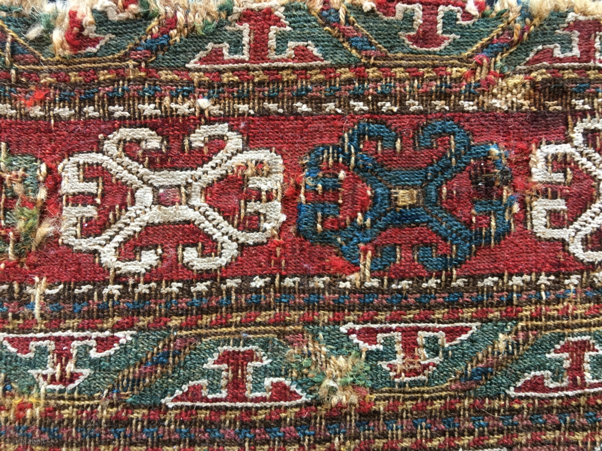 Karabagh sumack mafrash end panel. Cm 40x40 ca. Datable back to mid 19th century, roughly 1860sh. Crab design. Yes, it's actually a fragment, almost a wreck but still enjoyable. It certainly needs a further good wash.