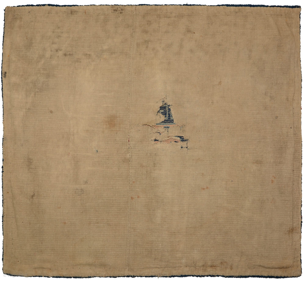Rare fret dragon seating mat woven in Ningxia, China, in the 18th century / 1700’s. Hand spun cotton warp (z?s) and weft (2 shoots, each of three off-white Z-spun single yarns) with fine lustrous wool pile and asymmetric knots open left, with a knot count of 32kpsi (496psdm). Four colours only; dark blue, light blue, golden yellow and apricot yellow, all naturally dyed. The archaic dragon heads remain recognisable while their bodies are geometric or fret styled. The back is covered buy a plain weave cotton cloth that is both hand spun and handwoven. Size is 83cm x 77cm (32.6in x 32.3in). It is in very good condition for its age, some low pile as to be expected but no ‘wear-through’ and no repairs or reweaves. a highly collectable carpet of a type that is only very rarely seen on the market today.
