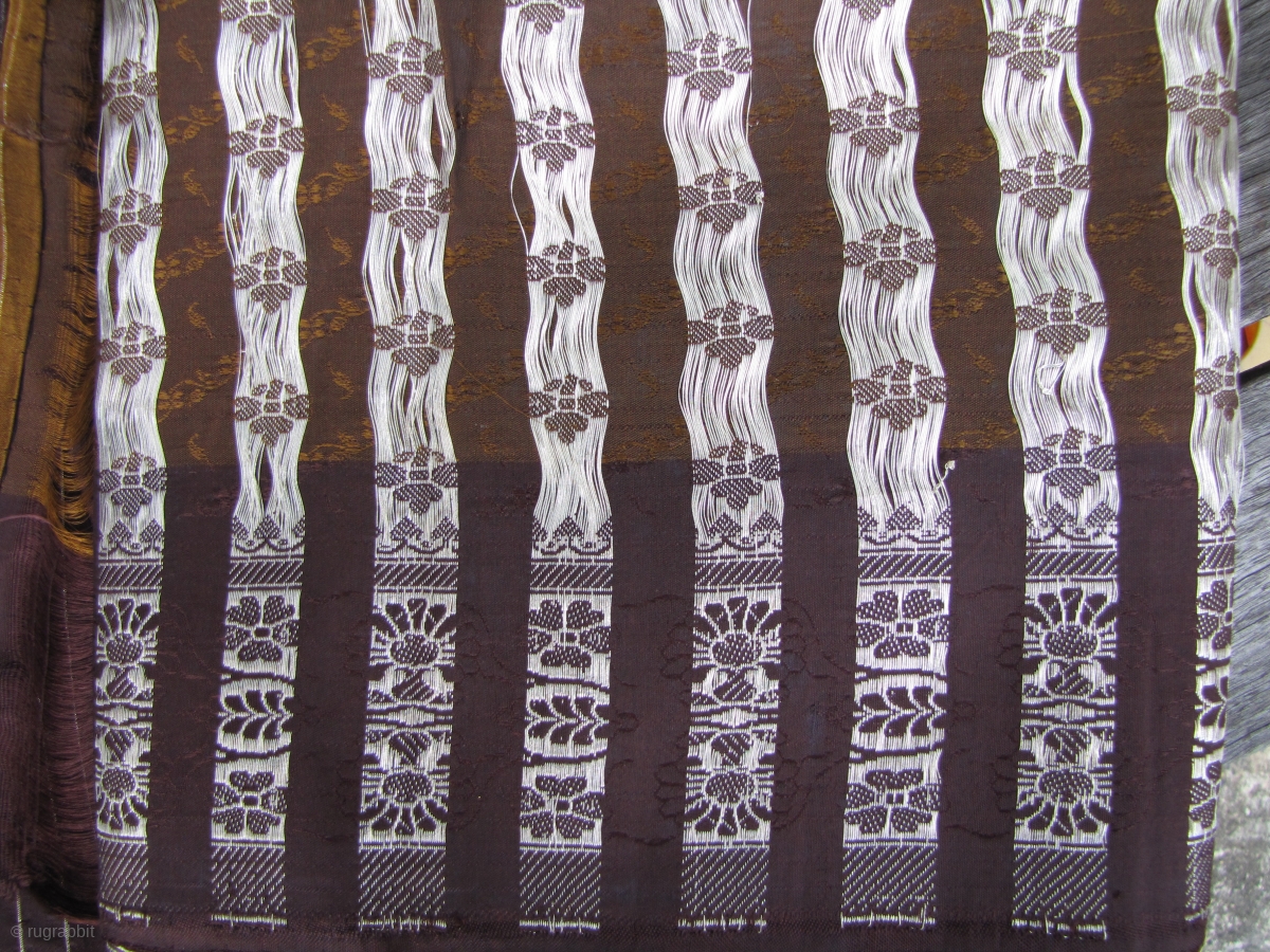 Formal Indian Sari (just like the ones you see in Bollywood movies), worn for weddings or important religious occasions. This has never been worn. i acquired it from an estate where it has been sitting in a trunk for the past 20 years, and the inside humdity, which caused the brown dye to bleed into the embroidered border somewhat. Please examine images. This l: 5m x 1.4m and is handloomed silk. It was woven in Banaras in the two toned Tanchoi style and silver thread “jari” embroidery. In the enlargements you will notice some missing weft threads on the end section, this is where it was meant to be cut and then the warp threads were braided and made into a fringe.