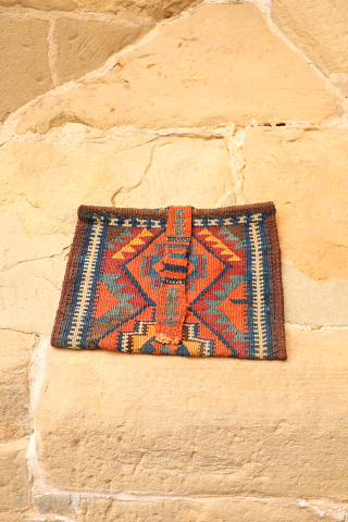 a rare Kurdish bag that has been opened out. This chanteh originally was folded in halve resulting in a square bag. The rectangular long and narrow strip was used to close the bag. All natural dyes. Sourced in Iran.