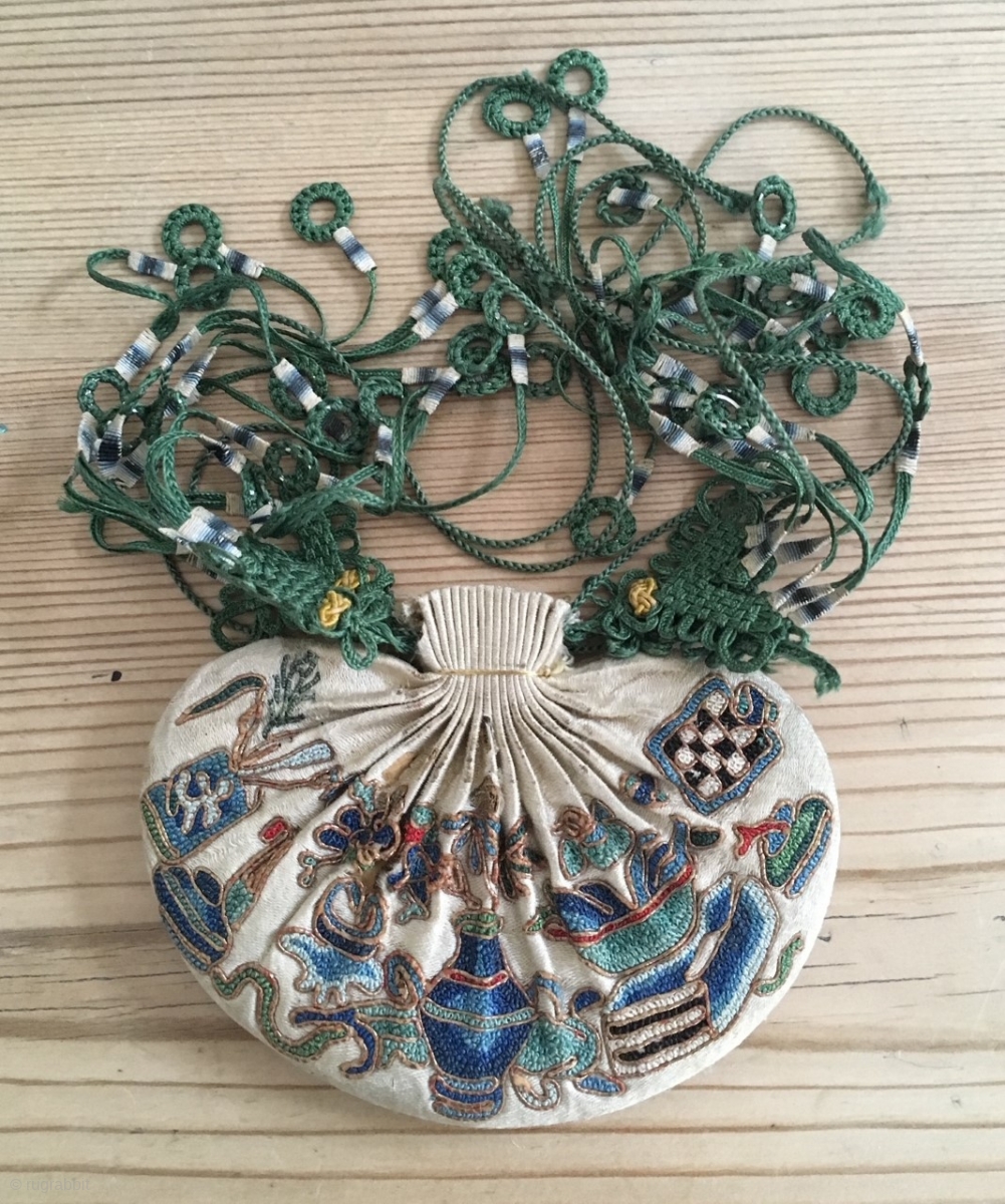 Small Chinese purse, or probably perfume bag, silk on silk, hand embroidered with good luck symbols, mostly in Pekin knots, and finished with very elaborate passemanerie braided cord, rings and decorative motifs in green silk. Late 19th century.