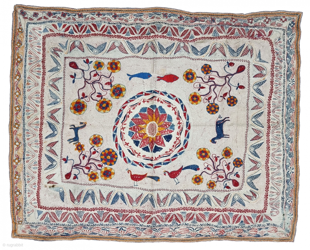 An Very Fine Folk Embroidery Kantha Quilted and embroidered cotton kantha Probably From East Bengal(Bangladesh) region, India. c.1900 -1925.