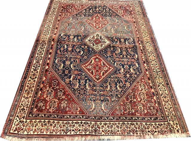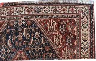 a late 19th Century sw Persian Qashqai . As you see, it does have some misusing at the ends bur rug has low even pile from top to bottom. No holes or tear in other areas, It absolutely is worth to restarted it. Gorgeous light blue fied with a nice abrash.It measures 4' x 6'-8".