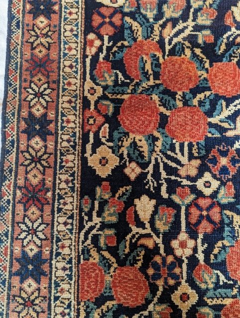 Detail of an Antique Afshar Golfarang rug, circa 1900, a beautiful range of natural dyes, with a unique star border design. size 3' by 3'11" contact us directly at rubiadarya@mymts.net