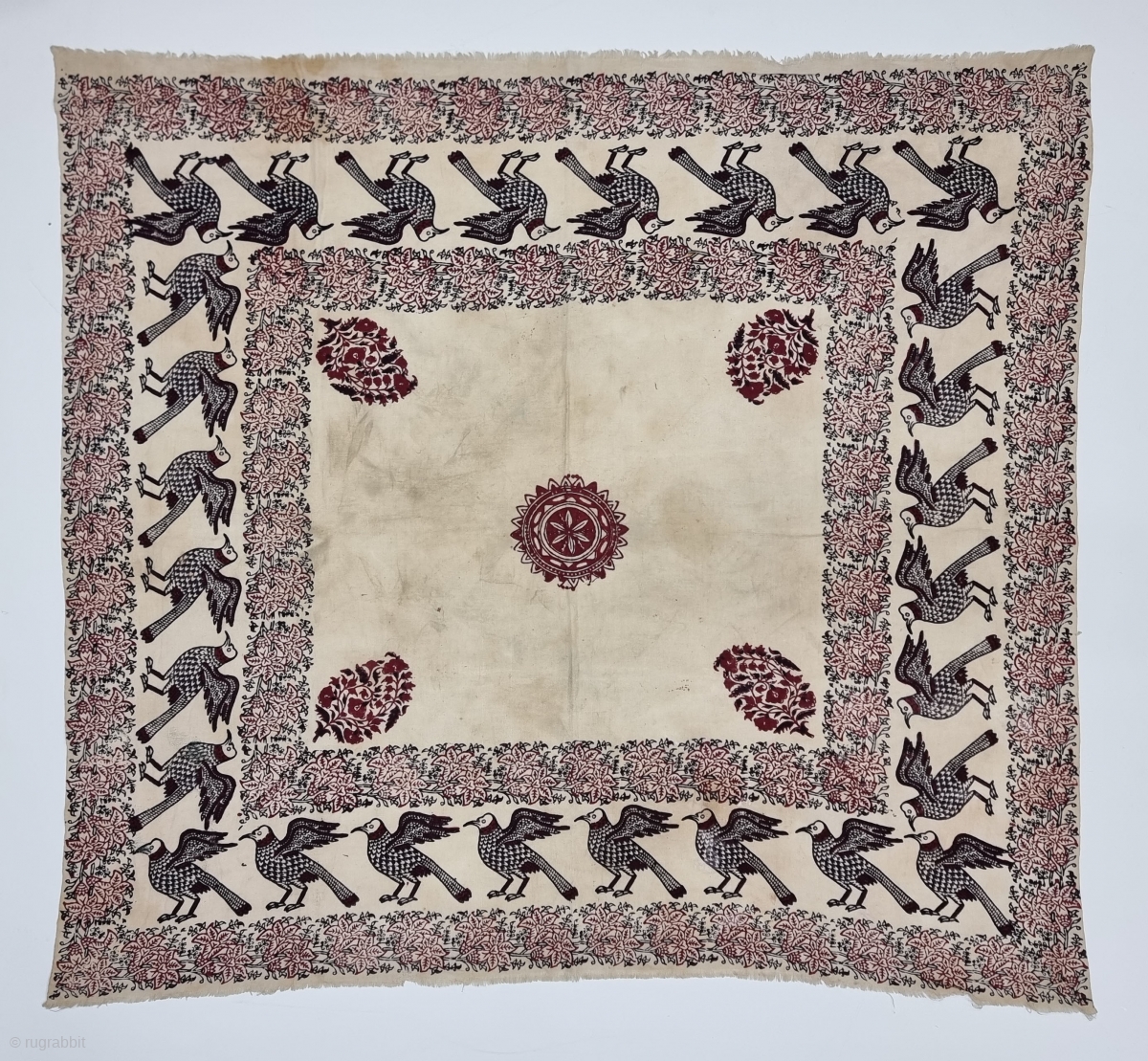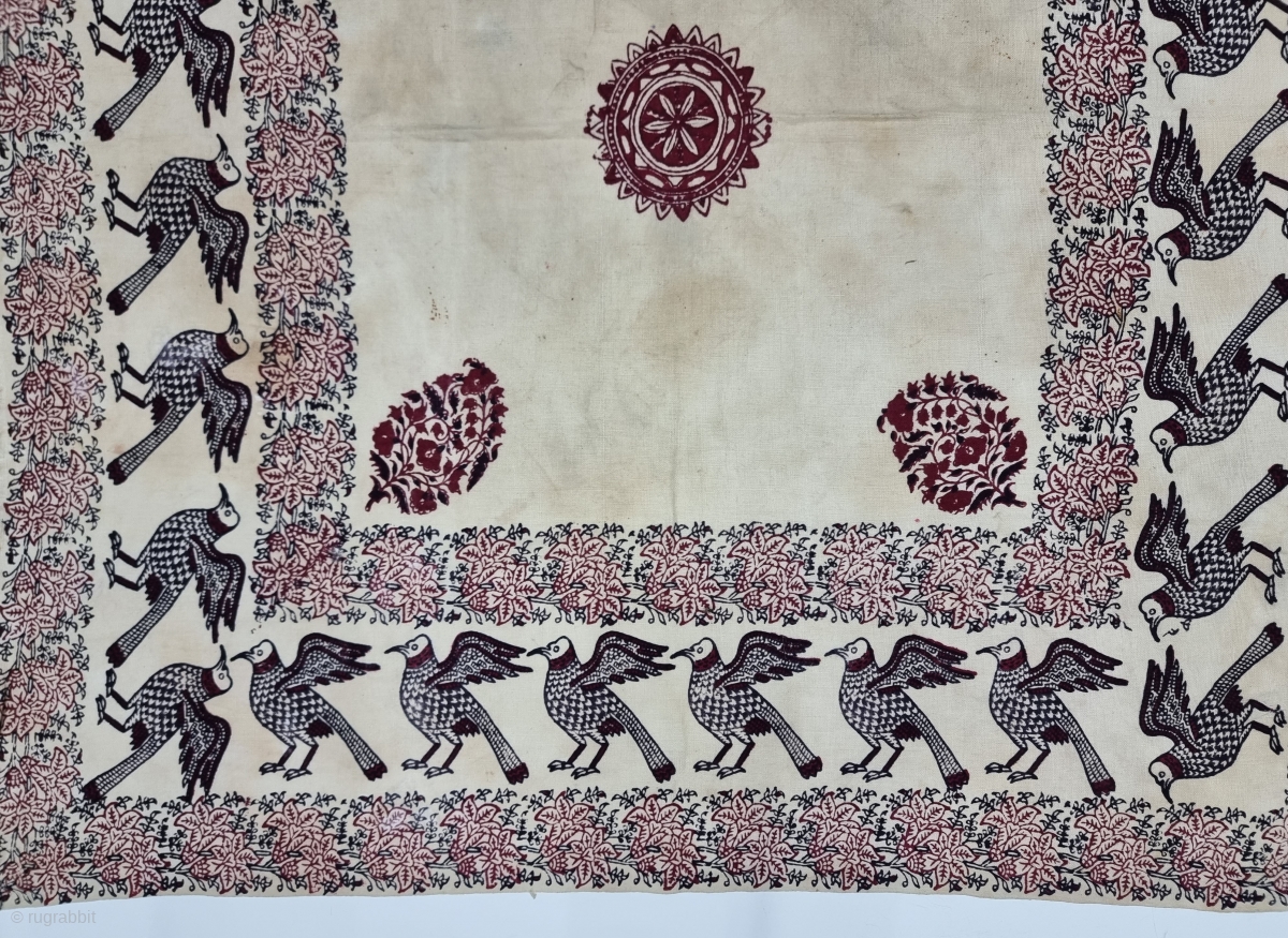 Block-Print With Birds and Floral Design , Kalamkari And Wood-Block , Hand-Drawn Mordant-And Resist-Dyed Cotton,
