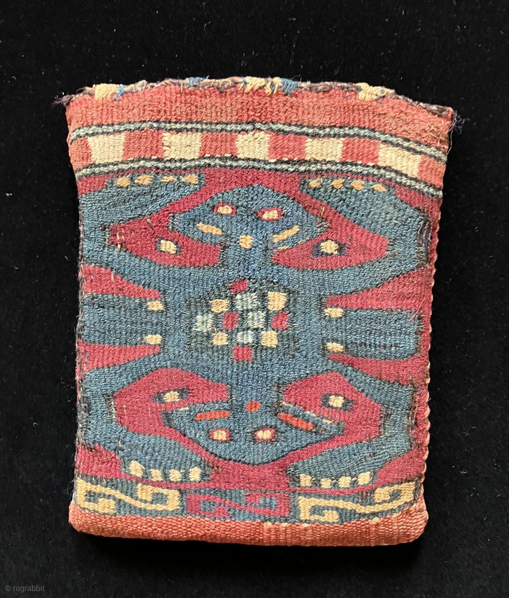 Small two-sided tapestry bag from the Nasca/Wari period. a.d. 400 – 700. The iconography is that of a double-headed anthropomorphic or zoomorphic being with arms and/or legs akimbo. Double–headed figures are ubiquitous in Pre-Columbian art. Sometimes the lower head resembles or represents the generative organs. This “alien-like” composite being could possibly represent an avian figure or even a shaman shape-shifter, but this is only speculation on my part. Whatever its meaning, the double and even triple entendre concept was well understood and often utilized in the world of ancient Andean textile art design. Professionally conserved. Size: 4.5 x 5.75 inches.