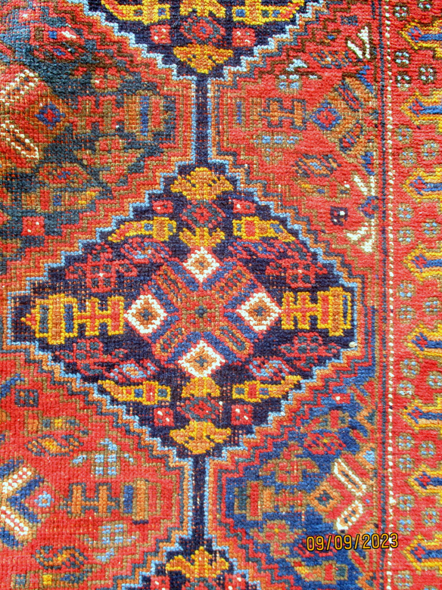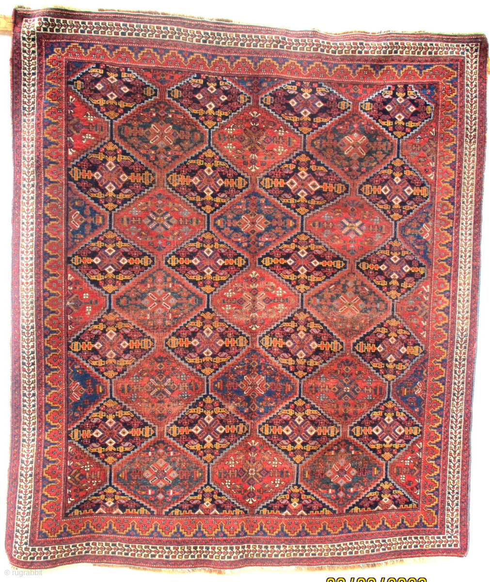antique afshar rug from the region of kirman in southern persia. The squarish shape is always a major factor in identifying Afshar weaving, both of their rugs and flat woven soumaks. Whereas most tribal and village rugs are rectangles the Afshars make this squarish shape. James Opie in his excellent book "Tribal Rugs" comments on this. He also shows as plates 12.5 and 12.6 a soumak with an almost identical colour range and design. This is a versatile piece. It is worn lowish but even and is intact. Quiet floor area, table cover, wall hanging or even a throw over an old bench or sofa are all contenders for it. Reference 166 x 138 cms., or 5ft. 6ins. x 4ft. 6ins. Euros 480.