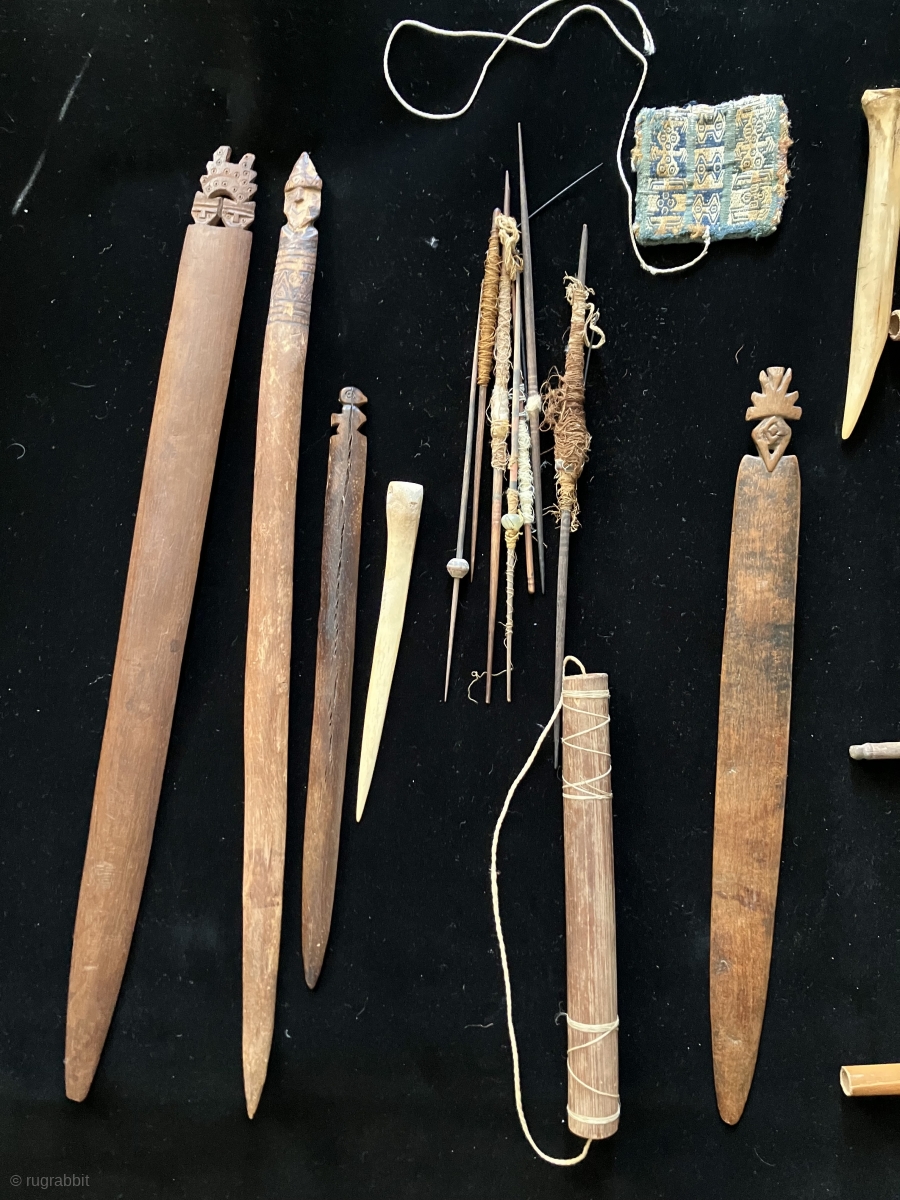 Tools of the trade. Pre-Columbian weaving tools including a loom with partly completed weaving, spindles, llama bone weft packing implements and weaving swords. All more than 600 years old.