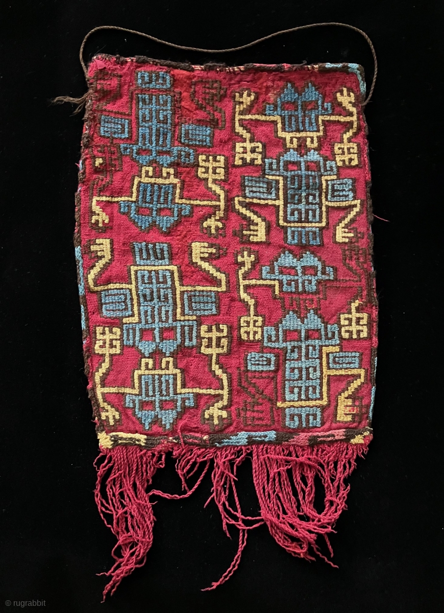 Water Strider Bag. This exceedingly rare, large, Nasca bag is in the so-called “Nasca Proliferous Style”. a.d. 300 - a.d. 600. Rio Grande Valley, Peru. Highly stylized zoomorphic forms are typical of this type of textile from the Nasca region. Four figures on each face of the bag alternate in direction left and right. The figures on this bag always reminds me of Water Striders, those insects that are able to walk on top of water due to a combination of high surface tension and long hydrophobic legs that help them to stay on top of the water’s surface. They more likely represent human or animal figures that are deliberately stylized as to be ambiguous. Spiders are also referenced in some textiles of this proliferous style. The bag is complete and in good condition. The structure is a balanced plain weave with supplmentary weft wrapping. Any damage was professionally conserved to a cloth liner. The bag is stable and supple. The intense red insect dyed color of this textile is very well preserved as are the blue and yellow dyes. The ground weave and patterning yarns are three ply alpaca yarns. Pieces in this style do not appear often in the market these days. Most have been collected years ago and reside in mainly in museum collections. Ex Neri collection, Ex Private collection London. Size: 9.5 x 16 inches.