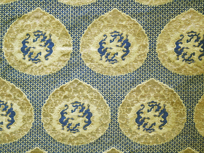 This exquisite textile fragment showcases the intricate artistry of Kinran, a technique that traces its origins back to 7th-century China but was further refined and perfected by Japanese artisans. Kinran involves the application of gold or silver foil onto resilient paper crafted from mulberry bark. Following meticulous burnishing of the metal, the paper sheets are meticulously cut into slender strips, which are then expertly woven into the fabric as threads on the loom. The end result is a textile with a surface that gleams like a mirror, casting a radiant reflection. This particular piece features tear-shaped medallions, each adorned with four elegant dragons set within a cloudband border. These captivating motifs are set against a striking backdrop of alternating blue and yellow diagonal grid patterns.