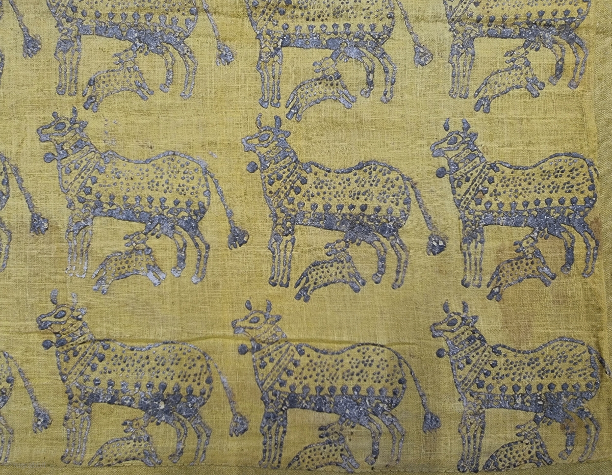 Pichwai Fragment for the Gopashtami From Gujarat India. Silver-tinsel Stamped with gum on Yellow Muslin cotton.