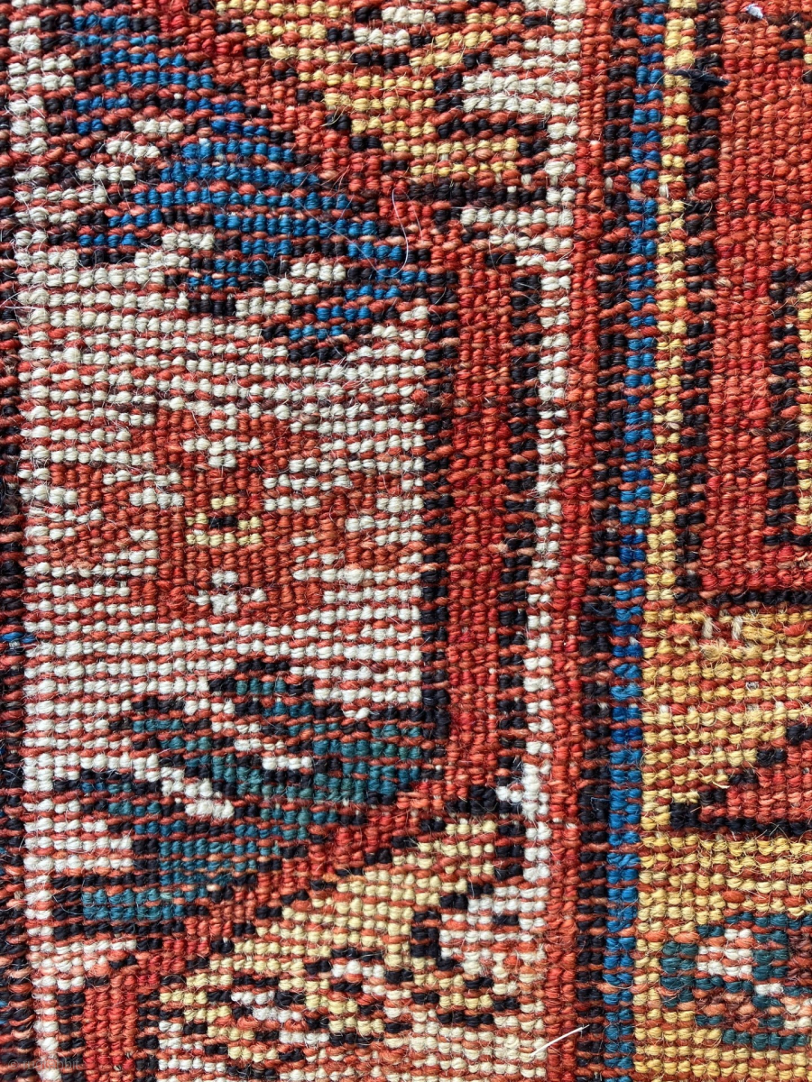 Antique West Anatolian rug, 4' x 6'2, Makri region, mid nineteenth century or earlier. Scattered areas of wear and damage with losses to the ends and sides (see photos). More than half of the original blue two-cord selvedge intact. All wool foundation with ivory warps and red wefts. All natural, saturated dyes with deep reds, soft, blue-greens, and a great yellow. Original, no repairs.