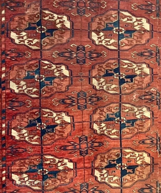 Antique Tekke Turkmen main carpet, 5'11 x 7'7, early nineteenth century, as indicated by the size and various other features - simple border system of early type with only a barber pole guard stripe separating the main border from the field, unusual 'chemche' secondary elements connected by vertical lines like the main medallions or 'guls,' simple four-star octagons in the main border with varied additional elements like flower heads, diamonds, and flattened octagons (see detailed photos). The age of the rug is also apparent from the smooth polished back, and from the lighter blonding over time of the natural brown wool used in the outlines. Another early feature is the originally square shape with five rows of medallions. Like some other early Tekke main carpets, this one was reduced down the middle of the rug market to give it the more rectangular proportions preferred by western buyers, which eliminated a row of medallions. The seam is tightly sewn and well done, visible on the right side of the next to last photo. There is a small patch from another carpet of similar type, age, and color (last photo). Wool warps and wefts. One area in the lower part of the rug is slightly lighter for reasons unknown, but mostly it has a beautiful rich burnt orange red field color and a rich greenish blue alternating with with the navy tone inside the medallions. Good, low pile overall. Selvedges redone. Kilim skirts missing, but all pile areas intact except for the outermost barber pole guard stripe at the lower end.