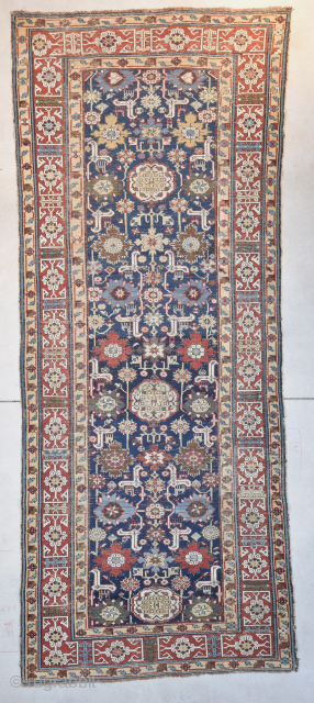 This pre 1850 Kuba measures 3’7” x 9’4”. It has a dark blue ground with a very interesting motif. There are 22 blossoms in shades of green, red, blue, and tobacco completely drawn except for the two at the top which are halves. The rug is completely covered in images of animals in ivory, red, green, checkerboards and yellow. This rug is all encompassed with an ivory Kufic border which is totally asymmetrical. The end borders have nothing to do with each other. The side borders are situated differently and out of align with each other. The reciprocal borders are on a yellow ground heading towards tobacco and have a meandering leaf and flower design. The ends and sides are complete. The rug shows wear consistent with its age. This is one of the most attractive and complicates Kubas i have ever seen.