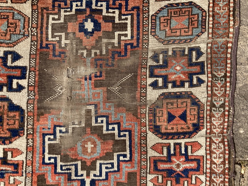 Strikingly graphic 19th century Eastern Anatolian runner, possibly Kurdish. Serious wear to the central field, some nitwit walked on it...