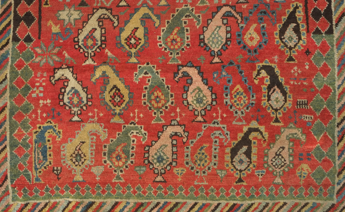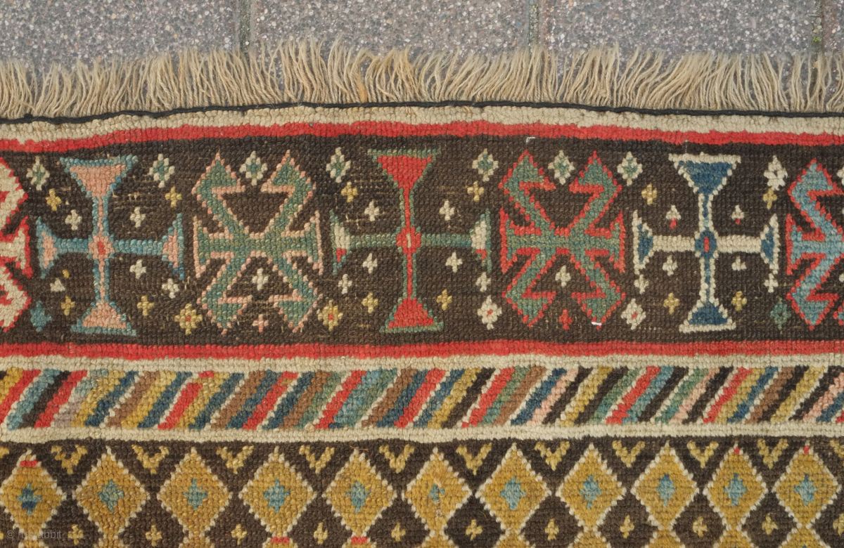 Caucasian or nw Persian rug, late 19th century. This rug seems to have a collection of motif schemes that suggest an agglomeration of influences. a wonderfully and unusual rug from the Bermuda Triangle of weaving. 125 x 244 cm. Contact danauger@tribalgardenrugs.com
