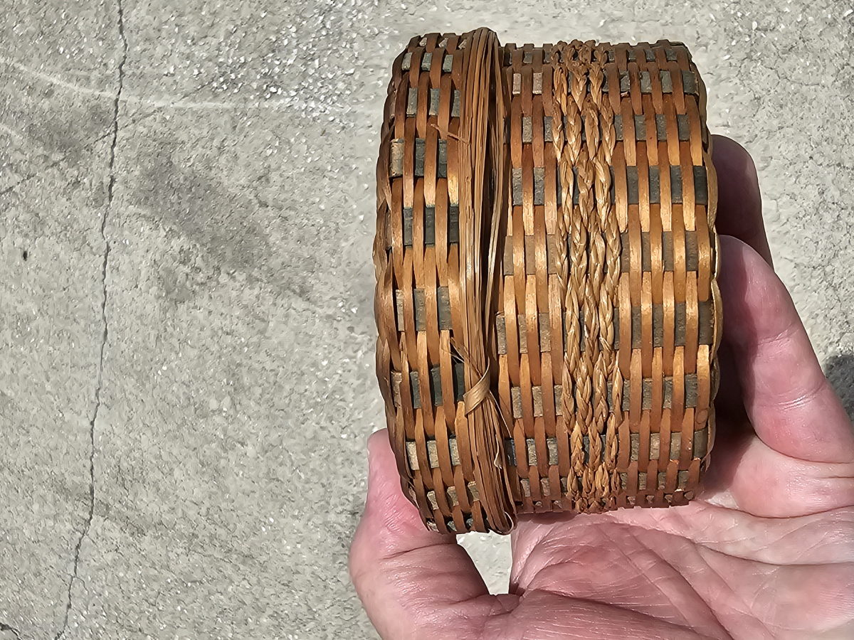 Antique Native American basket, Micmac People, also Mi'kmaq, hand woven ash splints and sweet grass, Maine, early 20th century, it has a lovely golden patina that only comes with age, some missing weavers, mostly along the rim, faded color, the approximate size is 4.25 inches wide by 2.25 inches tall, shipping is extra, if i don't respond to your inquire, please email me aarthur@cyberrug.com