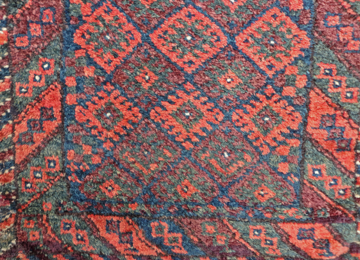 Belouch Rug. 1'6 x 3'4 including generous ends.... 64 knots per sq in (8x8).... Asymmetric knots, open right.... Thick pile, nearly full.... Design perfected toward top after experimental start.... Double wefted.... Non-original back now mercifully and painstakingly removed, otherwise as found.... Just the second decent Belouch i have discovered in years.... Bottom of rug is at left in full images.... Photos are important.... Actual shipping is extra.... Paypal please but contact first.... Contact: judesan@aol.com serious only.... Baluch Beludj Belouch Belutsch ....
