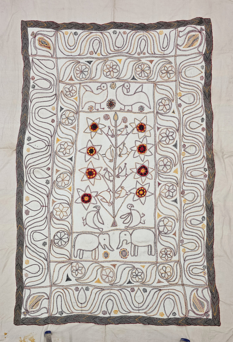 An Rare Kantha Tree Of Life Design, Fine Quilted and Embroidered Cotton Kantha Probably From East Bengal(Bangladesh) Region, Undivided India.