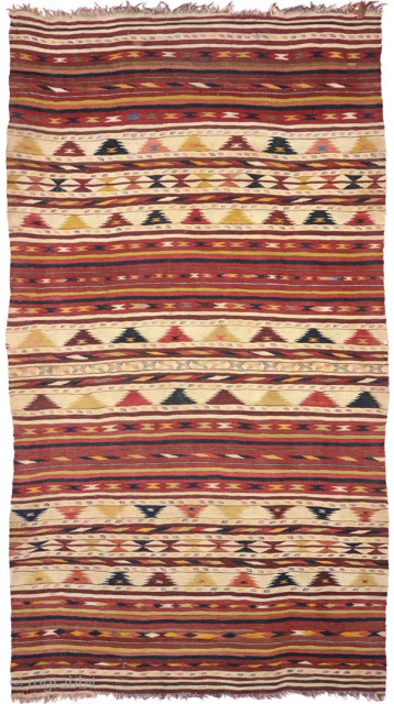 So-called Kashgar kilim. Little is known about these kilims, which were woven by Turkomen weavers purportedly living in the Silk Road oasis town of Kashgar, or its environs, in what was once known as East Turkestan. They are renowned for their tight fine woolen weave and their attractive design of which this is an excellent example. Made circa 1900, the size is 216cm x 119cm (85in x 47in). Overall it is very good condition. For more photos and information please see https://warpandweft.club/portfolio-item/kashgar-item-6/