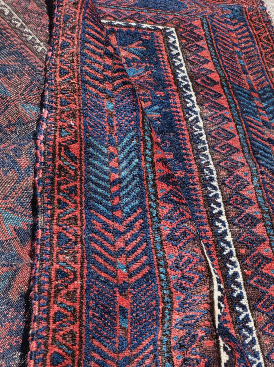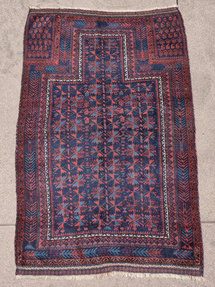 Lush blue-ground Timuri Baluch prayer rug. Great wool, vibrant natural color, super handle, very good condition with preserved flat-woven ends. Small silk highlights drawing an x x in gold. Unusual fishbone/ shrub border.Larger size, 108x163cms. This is a really good one!
