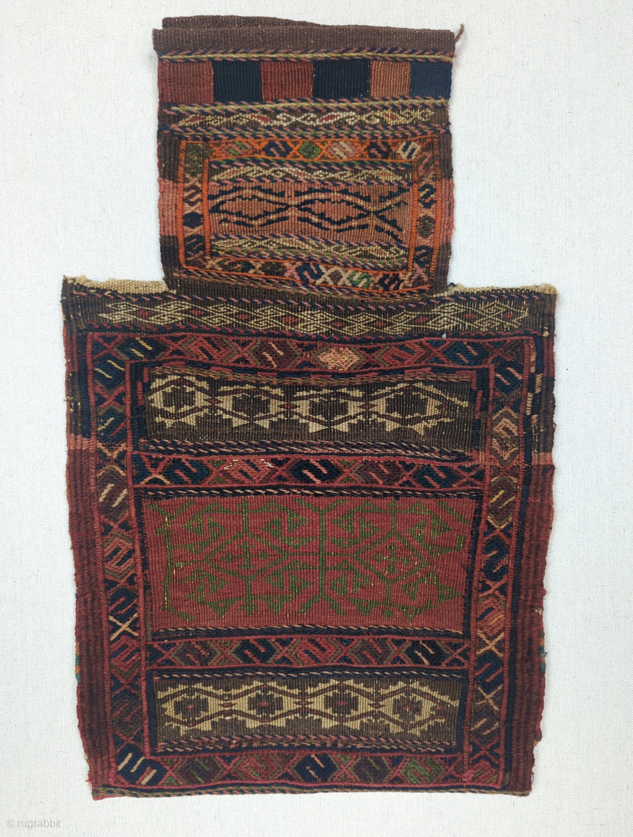 a Dynamic Baluch saltbag, made in the mix technique weave, from late 19th century, with all natural dyes. The henna red dye is high unusual for Baluch of this era and the greens gives the saltbag a certain depth and a wonderful presence. It has a beautifully woven multi colored back with henna, greens and some yellow, it's an excellent condition for its age and would make a wonderful wall hanging. Please contact us directly via email at rubiadarya@mymts.net