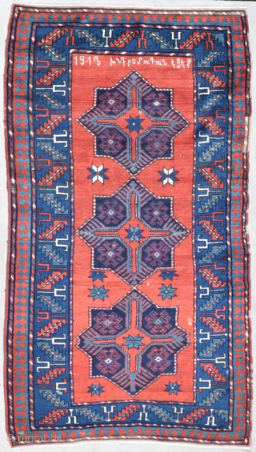 This Armenian Kazak antique Caucasian Oriental rug dated 1913 measures 3’9” x 6’8” has a red ground with an an inscription and three 8 pointed stars running up the field displaying a cross motif in red and blue. The major border is a leaf and calyx (wineglass) design. The calyx is in ivory then red with a sprinkling of tiny designs. The rug is full pile. The ends and sides are complete. It is clean and ready to go.