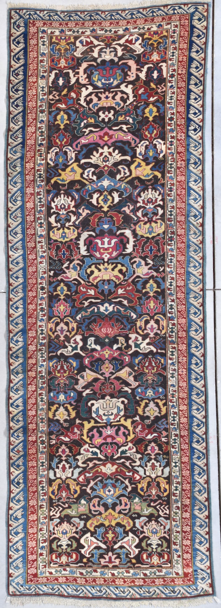 This circa 1850-1875 Kuba Bidjov runner #7909 measures 3’8” x 10’8”. It has a dark brown field containing the very rare and very well-known Bidjov design in tobacco, ivory, light blue, maroon, Khotan pink and butter yellow with the design running up the center as in all Bidjovs. a modified meandering vine and flower runs along the inner border. The next border has pale rose colored flowers on a darker rose ground. An interesting little touch in the flowers is that some of the centers of the flowers are in ivory and some are in blue or black. The outer main border is a running dog motif in ivory, blue and touches of red. The rug is basically full pile or if you are really touchy it could be considered evenly low. After all, it is a brown ground rug. The ends and sides are complete. It is clean and ready to go.