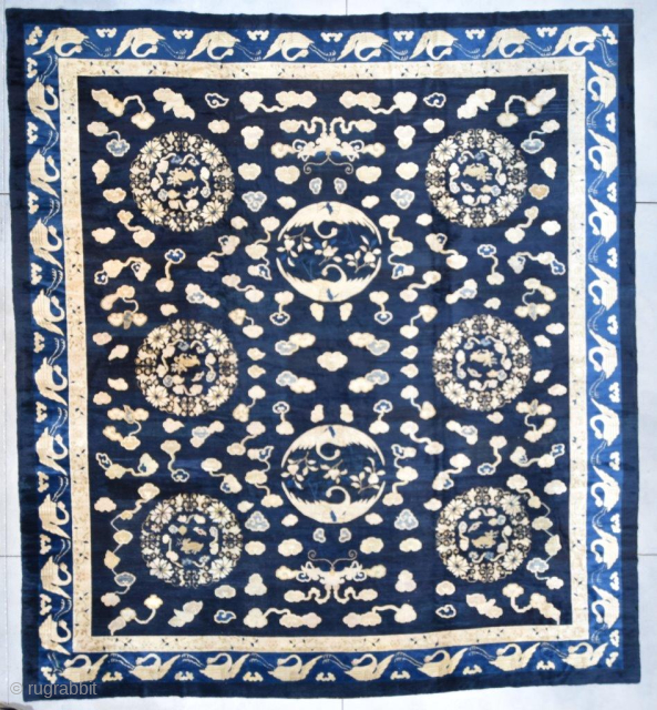 a favorite! This circa 1860 antique Peking Chinese Oriental carpet rug #7080measures 14’0” x 15’5” (425 x 471 cm). It has a navy blue ground with six flower wreaths containing an antlered dear. There are three up each side. There are two medallions composed of circling cranes whose tips of their outspread wings almost touch to form the circle, filled with what appeared to be flowering fruits stems. The field is filled with an amazingly drawn cloud motif in ivory, lighter blue and a couple shades of light brown. Between the upper and lower stag medallions and below the circling crane medallion is a beautifully drawn fantastic butterfly, one at each end, whose tail extensions morph into clouds. The minor border is a meandering vine and flower motif on an ivory ground. The major border is a paler blue than the field containing ivory swans or cranes. This rug is woven with the finest possible wool that money can buy. It has the look and feel of velvet. There really is none better. The condition of the rug is essentially perfect, with one or two places that are slightly low. These low areas cannot be seen when looking over the rug but only when you look into it.