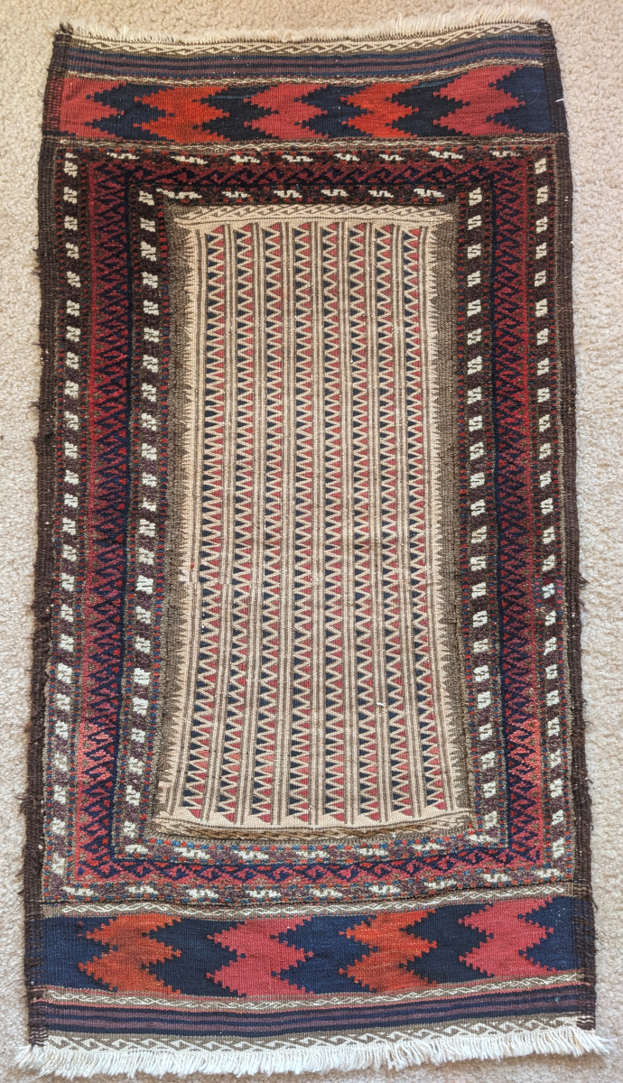 Very graphic Baluch mixed technique sofreh. Knotted pile borders, a fine geometric repeat flat-woven weft float brocade field with kilim ends. Saturated all natural dyes. a rare and compelling artistic piece in remarkable original condition. Size is 56x106cm.