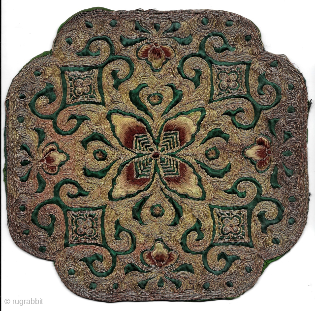 Lovely pair of embroidered quatrefoil round panels, circa first half of 20th century. The stitching is in excellent condition but some discoloration on the edges. Diameter 20cm/8in.