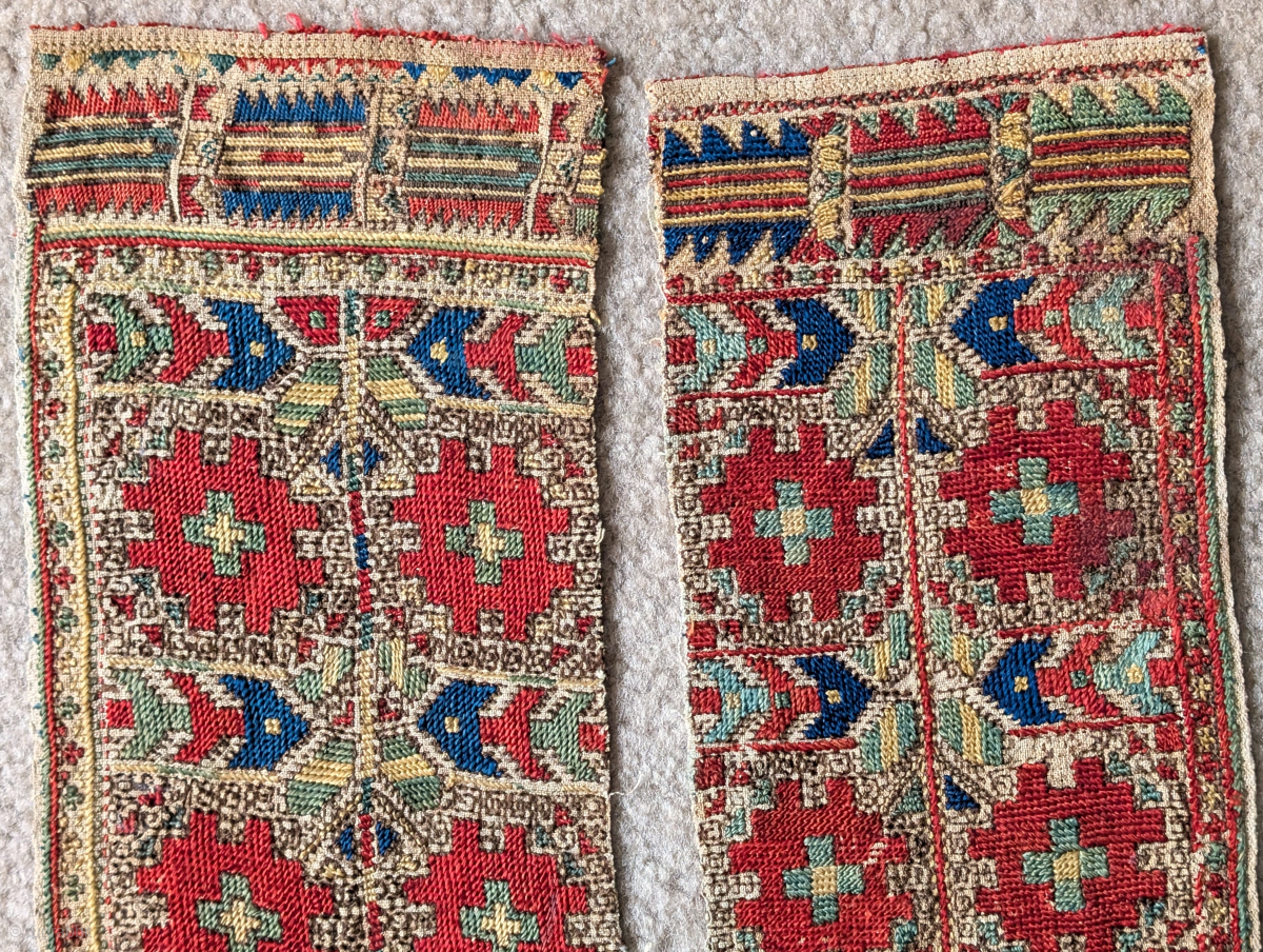Balkan / Macedonian? silk embroidered pair of bands. Possibly cuffs or sections from a bridal pillow. Fantastic saturated natural color. Fascinating drawing. Each measures about 30"x7".