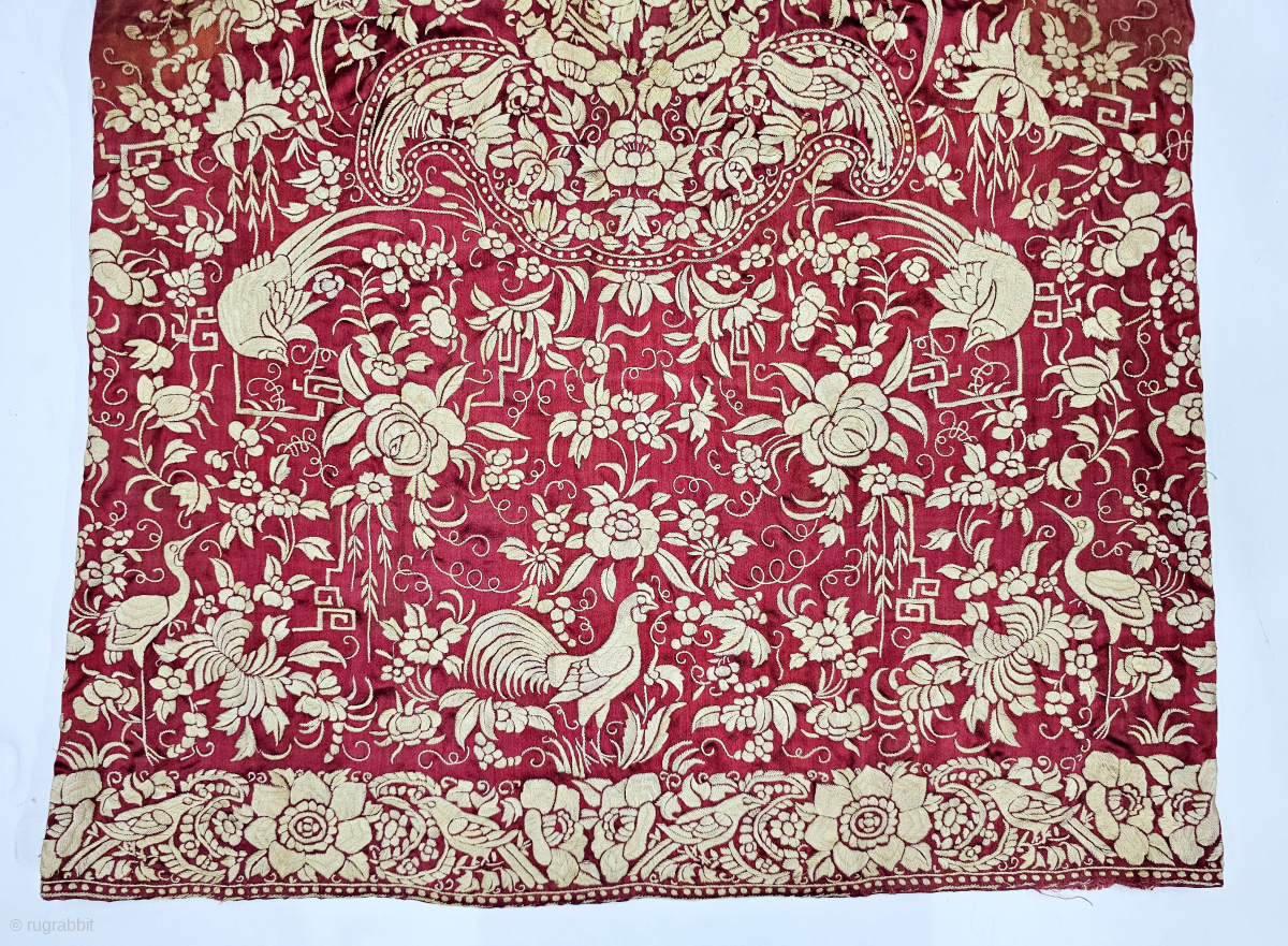 This kind of Jhabla was embroidered by Chinese artisans in the town of Surat in Gujarat for the Parsi women of that region. The Parsis are a Zoroastrian community in the Indian subcontinent. They are non Muslim Persians that were driven away from Iran when it became Islamic.
