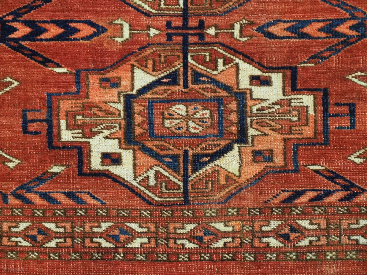 Antique Tekke Turkmen 6 gul Torba with superb colour, this example is of the classic format for this design, similar to examples that are published in most Turkmen books. The drawing of both the major and minor guls is of an early form with a very open and spacious feel, the main guls are of a very large size. Note the double horned animal heads inside the main guls and the complete 'bow and arrow' to the minor gul; all signs of an early date.