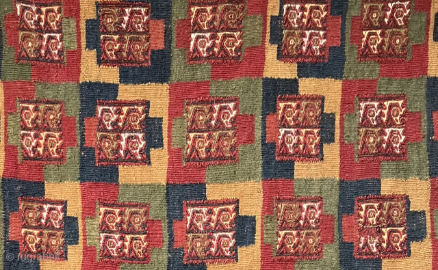 Impressively large pre-Columbian coca bag. 44 x 24.5 inches! This is a classic Chuquibamba designed bag with nine pockets. ad 1000 - 1475. i have taken to calling it" Godzilla" because of its immense size. There are only a few known bags of this type and size - all in Peruvian Museums. This bag is stabilized to a backing cloth and ready for mounting to a frame for display. It was formerly in an old collection based in London. This is the largest ceremonial coca bag i have seen. The wonderful color quality and the state of preservation of its color is excellent. The weave is fine. This is a serious textile from the Andes. One can read about such things in a new and excellent publication by Mary Frame titled: Textiles Chuquibamba, 1000 - 1475 d.c.. i highly reccommend it as it is the first serious publication to address this group of Andean textiles and the culture that made them. i do have other bags and weavings made by this group available, but none so prodigious as this one. Contact me directly via my email address if interested - jameswblackmon@gmail.com