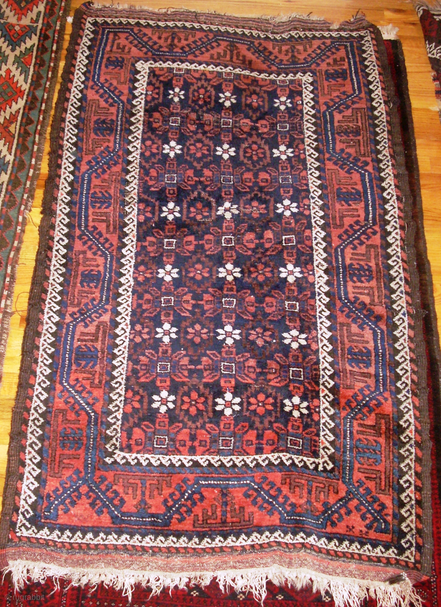 Antique Baluch rug with very good pile for rug of its age (circa 1900) and with original kilim endings. Even with slight crinkle, it can still be used on the floor. 3' x 5'4." sold