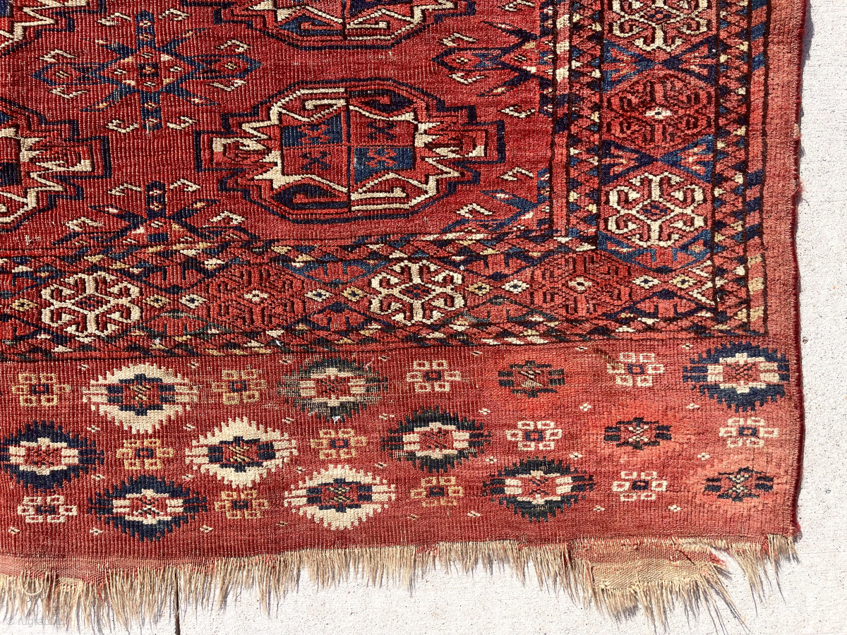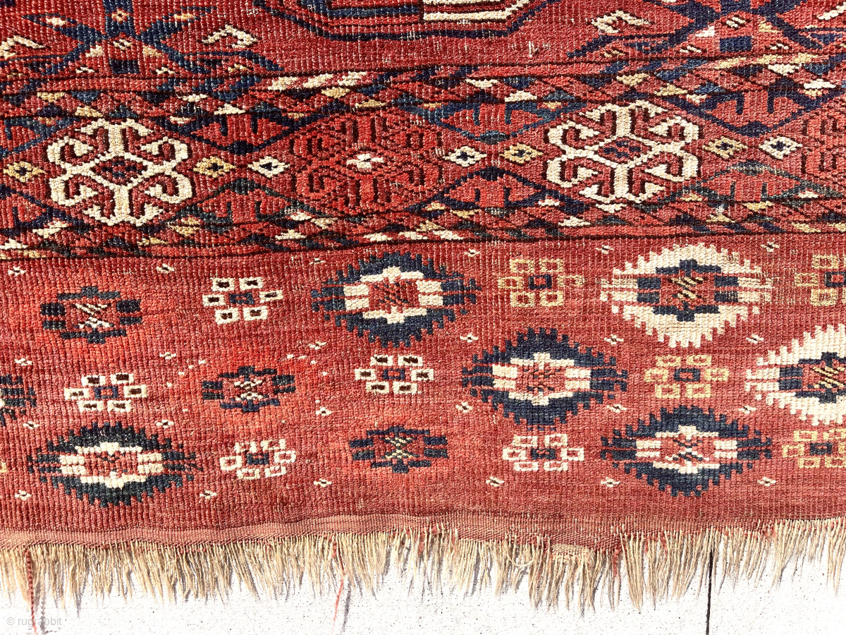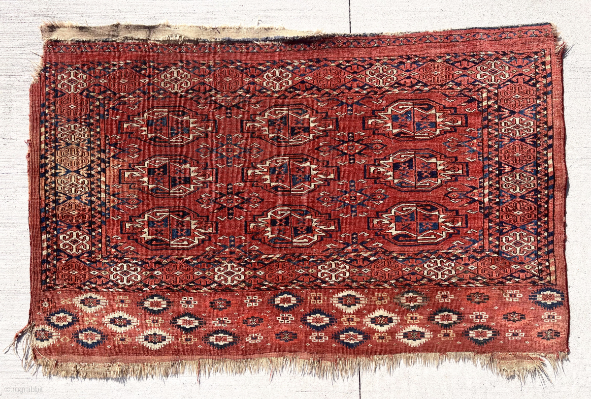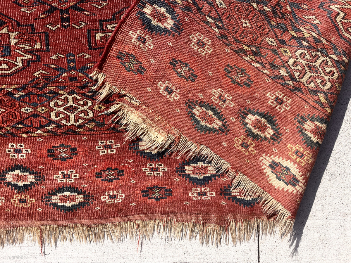 The pile of turkman bags is dangerously high. Older large yomud or kizil Chuval in rough condition but it has a skirt panel i like very much. Corner gouges and a hand sized area of staining. Lots of yellow highlights. Needs a wash. Not an auction, you can just buy. Good age, ca. 1875 $295 or bo 36” x 55”