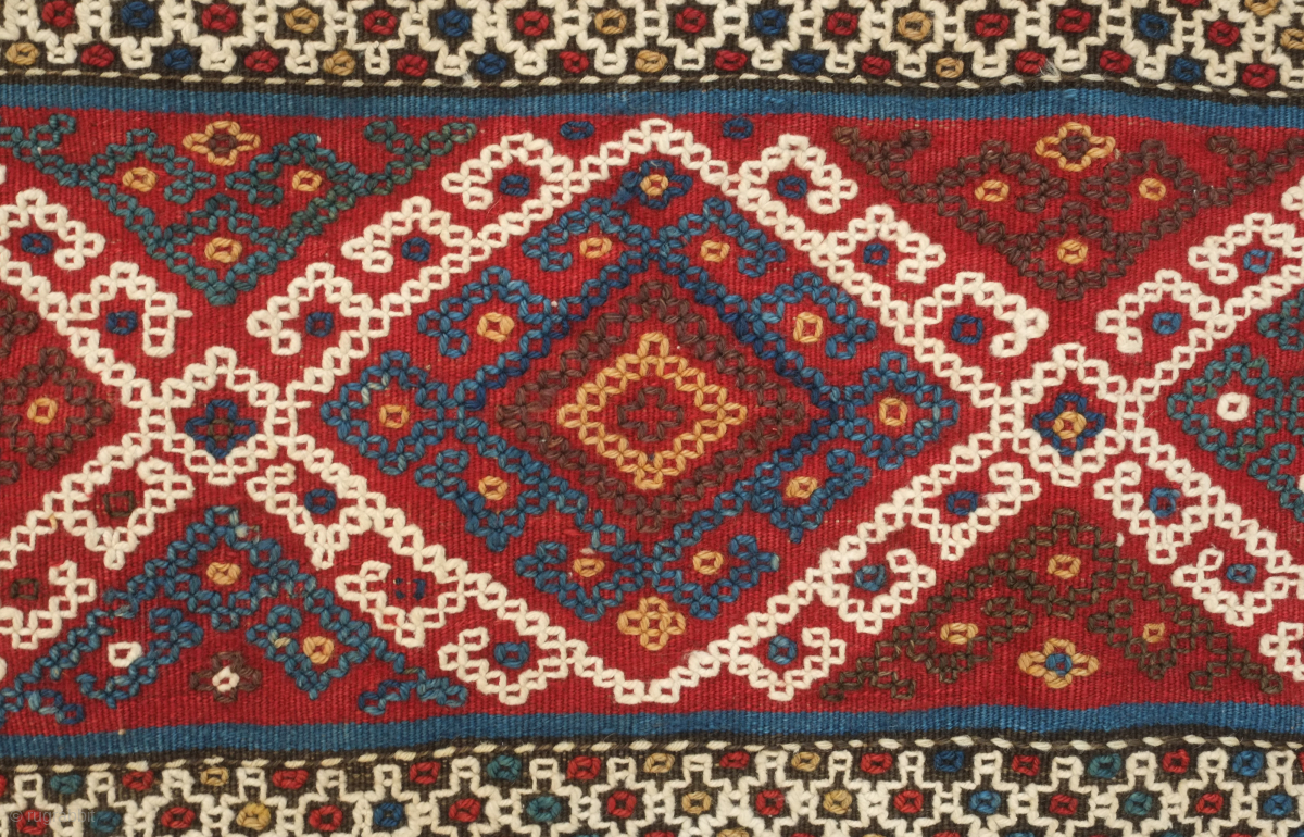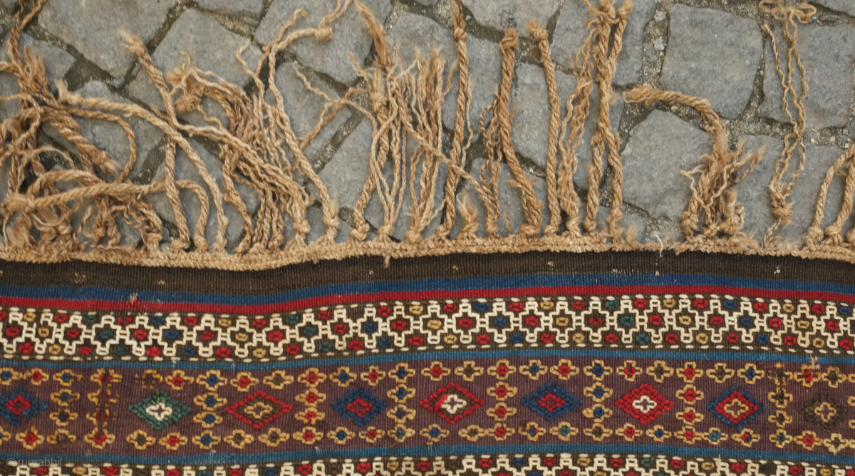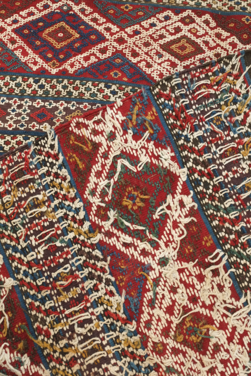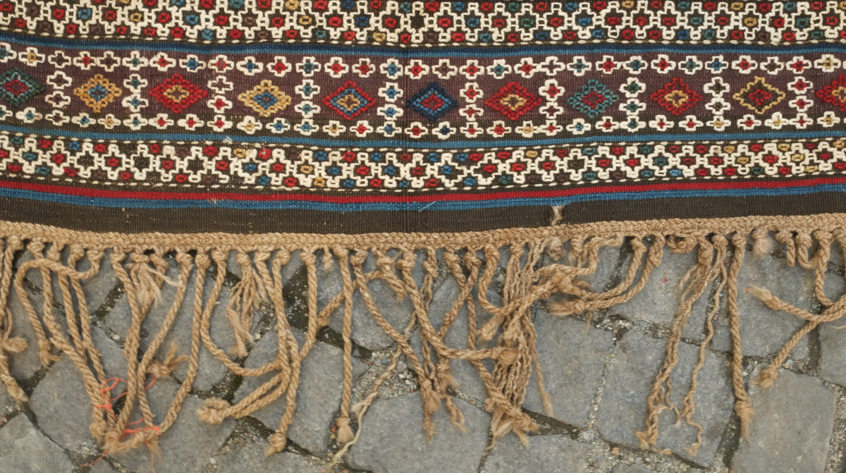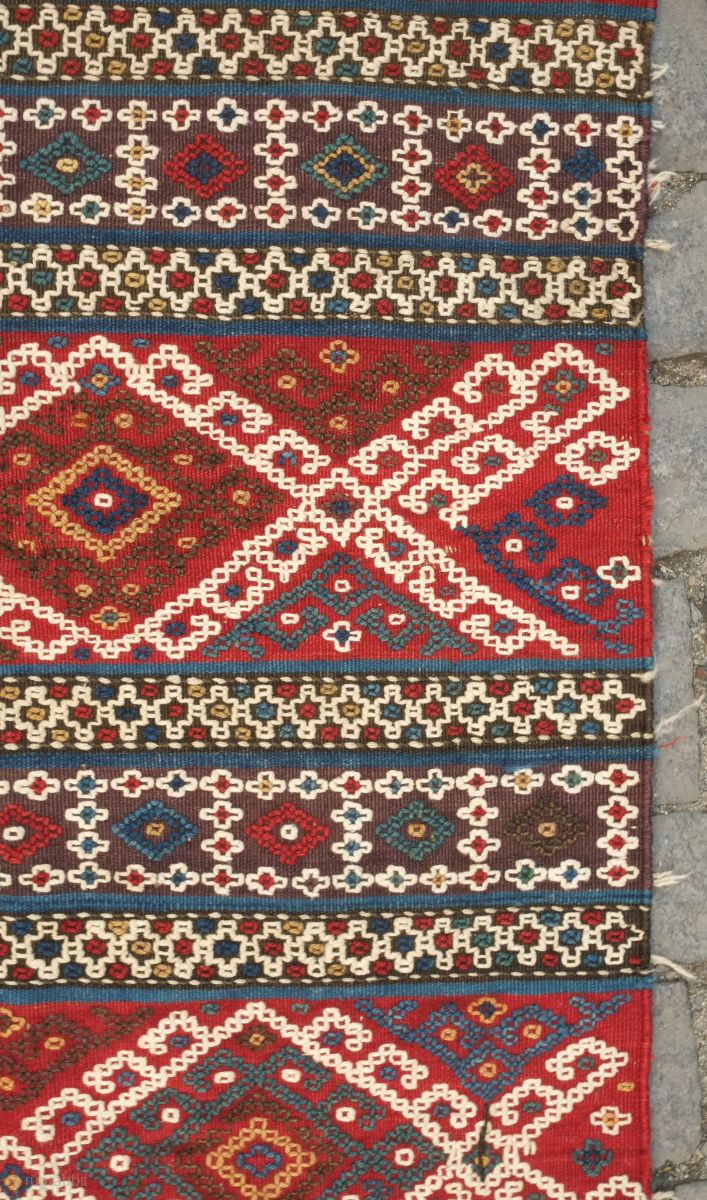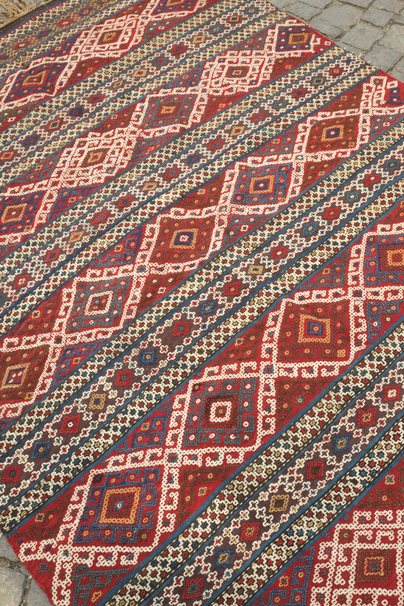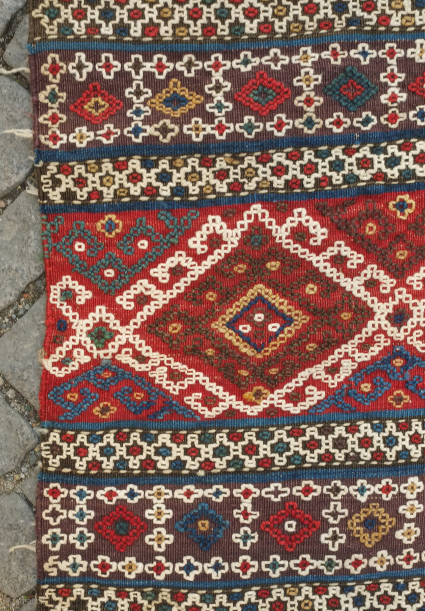 Borchalo Kilim, 19th century. Embroidered motifs all over. Its colors are wonderful deeply saturated natural dyes. Some of the bands are in a very deep purple. 155 x 233 cm danauger@tribalgardenrugs.com
