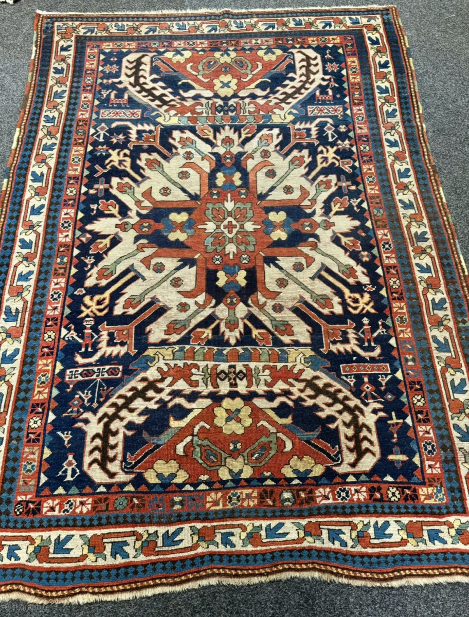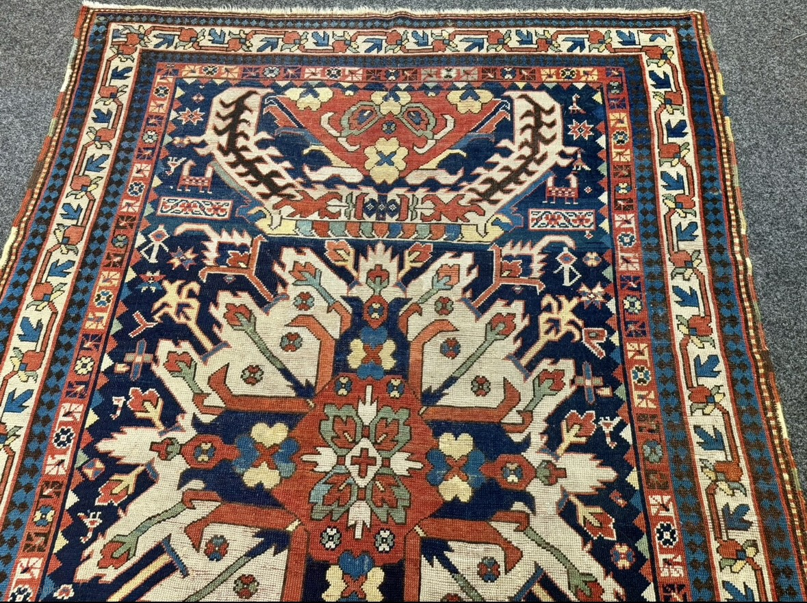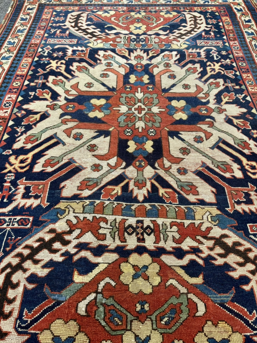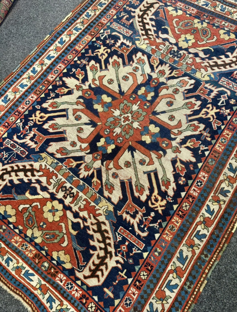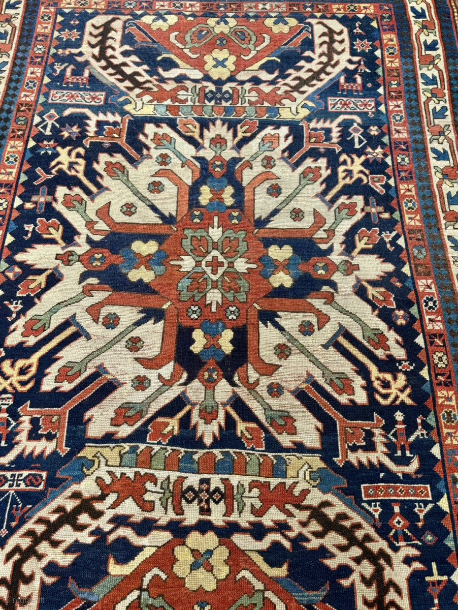 a remarkable early example of the famous Eagle Kazak rugs: This rare Chelaberd piece from Karabagh features the iconic "Sunburst" medallion set on an unusual blue ground. Its bold geometric design and luminous natural dyes echo Caucasian workshop carpets of the 17th/18th century. a true collector's item and museum-quality Caucasian rug. Size: 205×150cm / 6,8ft by 5ft. Age: circa 1800 please visit my website for more: http://www.najib.de