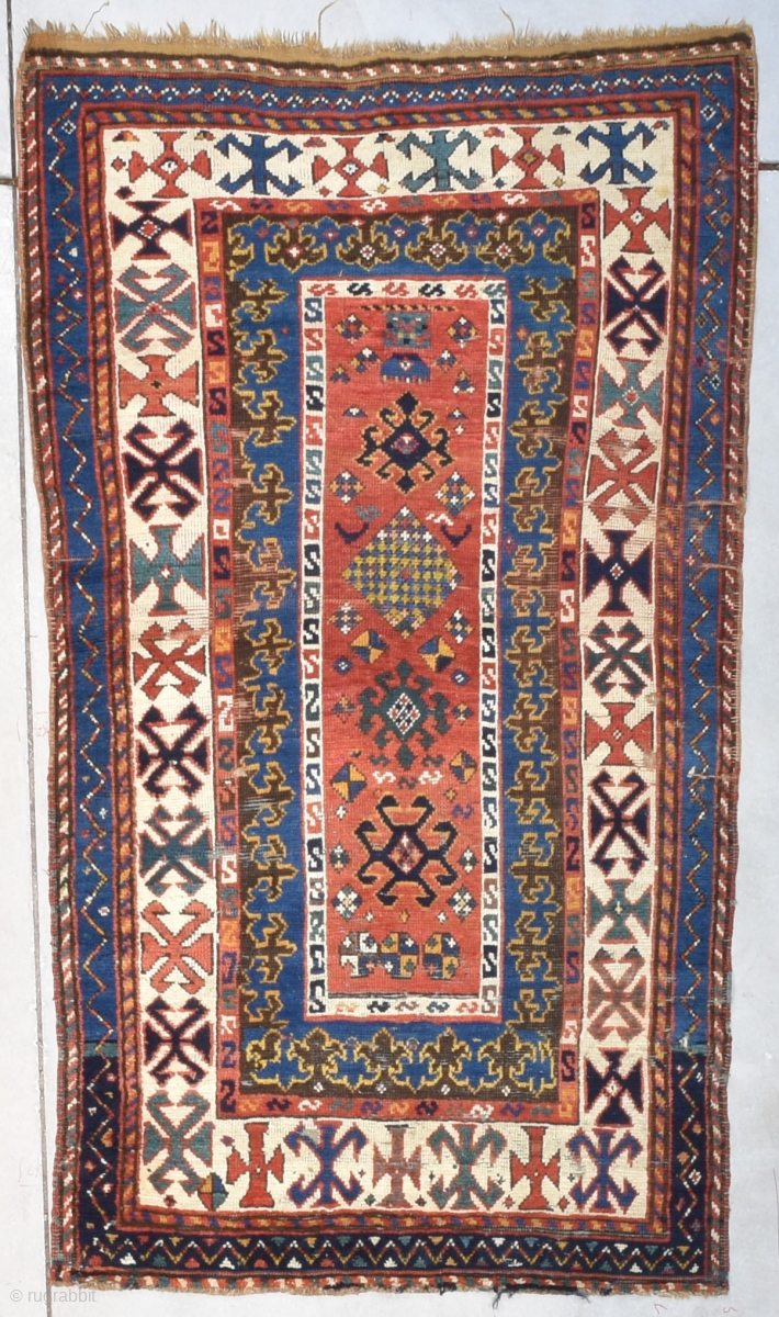 This third quarter 19th century Kazak Oriental rug #8200 measures 3‘3“ by 5‘11“. It has a rectangular center field in red, which is filled with asymmetric motifs of different shapes, sizes and colors. Three of them look like spiders in dark blue and dark green and squares split into triangles. There are stop signs split into corners and lazy ‘s’ designs. This is surrounded by a narrow ivory border with lazy ‘s’ motif all on a complicated blue and dark brown, long and narrow field. The browns are down, but the blue is not. These face each other for a strange two dimensional design. This is encompassed with a beautiful red narrow border of lazy ‘s’ design, all encompassed by a large ivory main border containing designs in red and blue that are unique to me. I’ve never seen anything like this! There’s a minor border in green and blue with triangular designs separated by two minor borders. The rug shows slight wear as photographed. The ends and sides are complete. The rug is clean and ready to go.