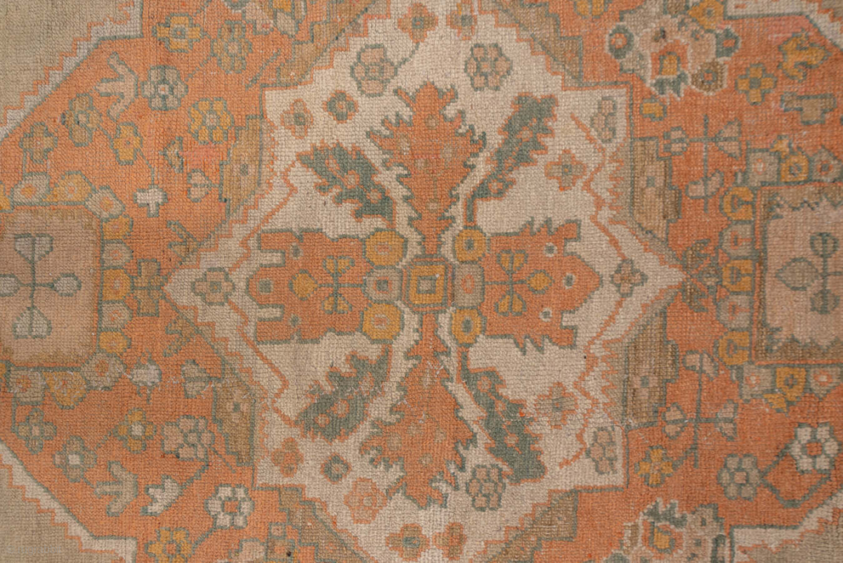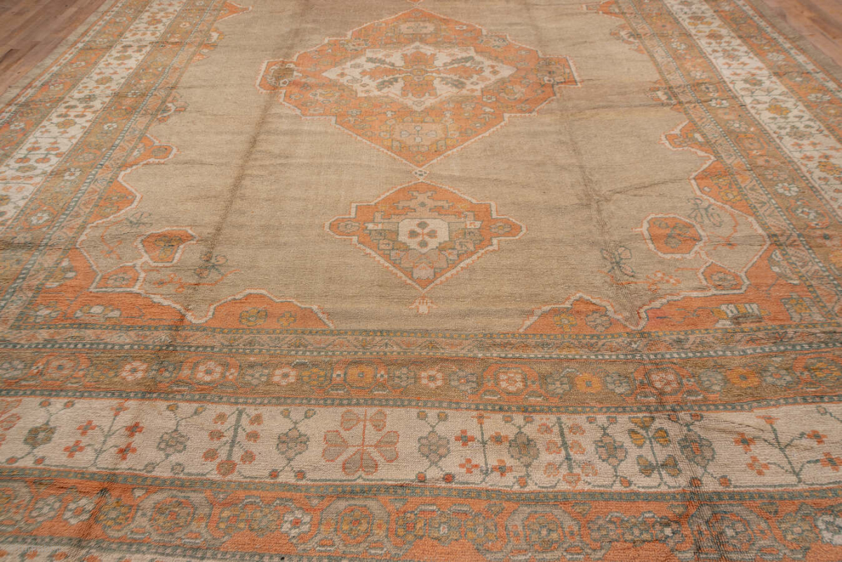 This exceptional antique Oushak rug, woven circa 1900, is a magnificent example of large-scale Anatolian weaving. Measuring over 13 × 16 feet, it features a grand central medallion design flanked by smaller pendants, all set within an expansive open field in soft earth tones. The muted palette of taupe, sand, and faded rose is gracefully accented with ivory and pale apricot, giving the rug a refined and versatile aesthetic. Its wide, intricately detailed borders are filled with stylized floral and geometric motifs that showcase the artistry of Oushak weavers. The combination of large scale, balanced design, and gentle patina makes this rug a statement piece for both traditional and contemporary interiors.