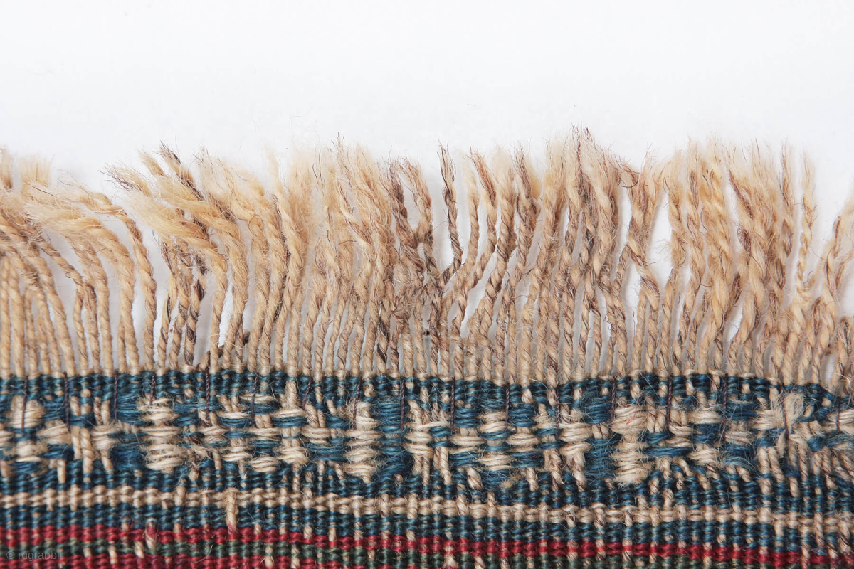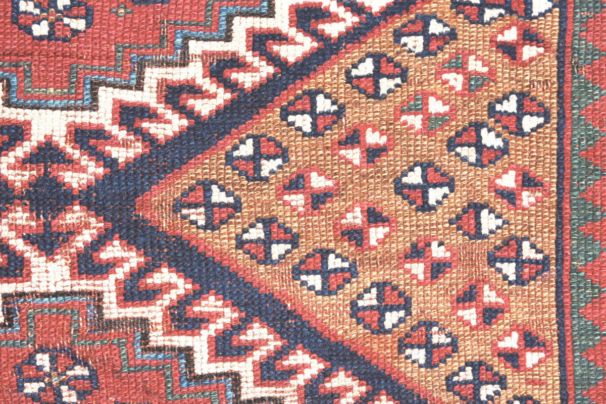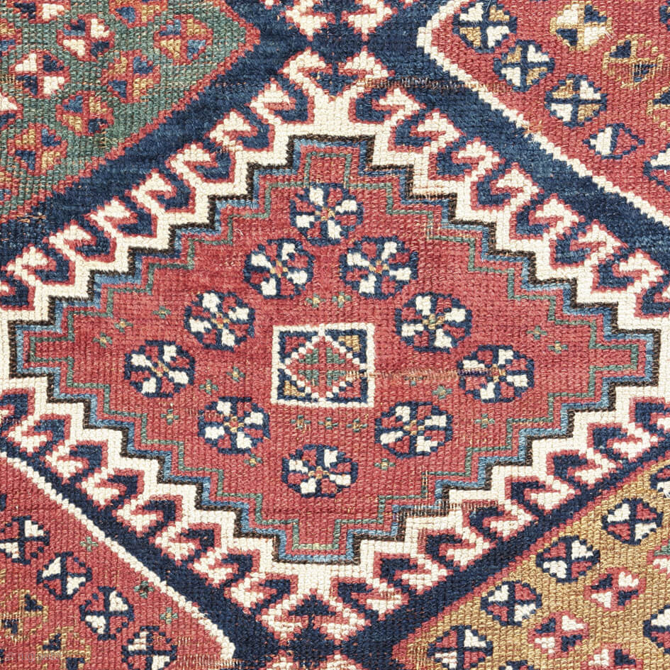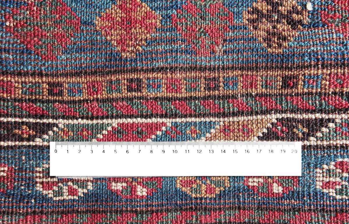 This s a collector´s and also a beautiful decorative piece, woven in last quarter of the 19 th century, with varied and saturated dyes that became milder by age. Five medallions decorated with a reciprocal guard of ‘bird heads’ in ivory and midnight blue, are placed on a field transformed on both sides to polychromatic half diamonds, filled with floating little diamonds. The colors of this “field”: saffron yellow, brown, blue, madder red and green, are randomly disposed according to the weaver wishes or may be due to the availability of dyed wool, any the case, these variations add interest and contrast to the composition. The border system is very elaborate at the same time, plenty of tribal flavor. It is composed by nine guards: at both extremes, reciprocal triangles (red-green and brown-blue), small guards with squares (the ivory one providing contrasted framing), two main guards with multicolored rosettes (the outer one, stands out in midnight blue), finally 3 guards with diagonal lines (the main one named “barber pole” guard). On just one medallion, we find four highly stylized animals, probably a reference to the tribe totem.